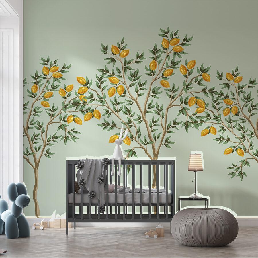 Transform your space with this delightful mural featuring a tree bursting with yellow fruits. It’s like bringing a piece of nature indoors, where those vibrant fruits are just waiting to add a splash of cheer. Imagine sipping your morning coffee surrounded by the lush greenery—it’s practically a mini escape to a sunny orchard. This design not only brightens the room, but it also sparks conversations. Guests might ask if you have a secret garden. Perfect for kitchens or living rooms, it’ll surely charm anyone who walks by. Bring a subtle touch of warmth and whimsy to your home.