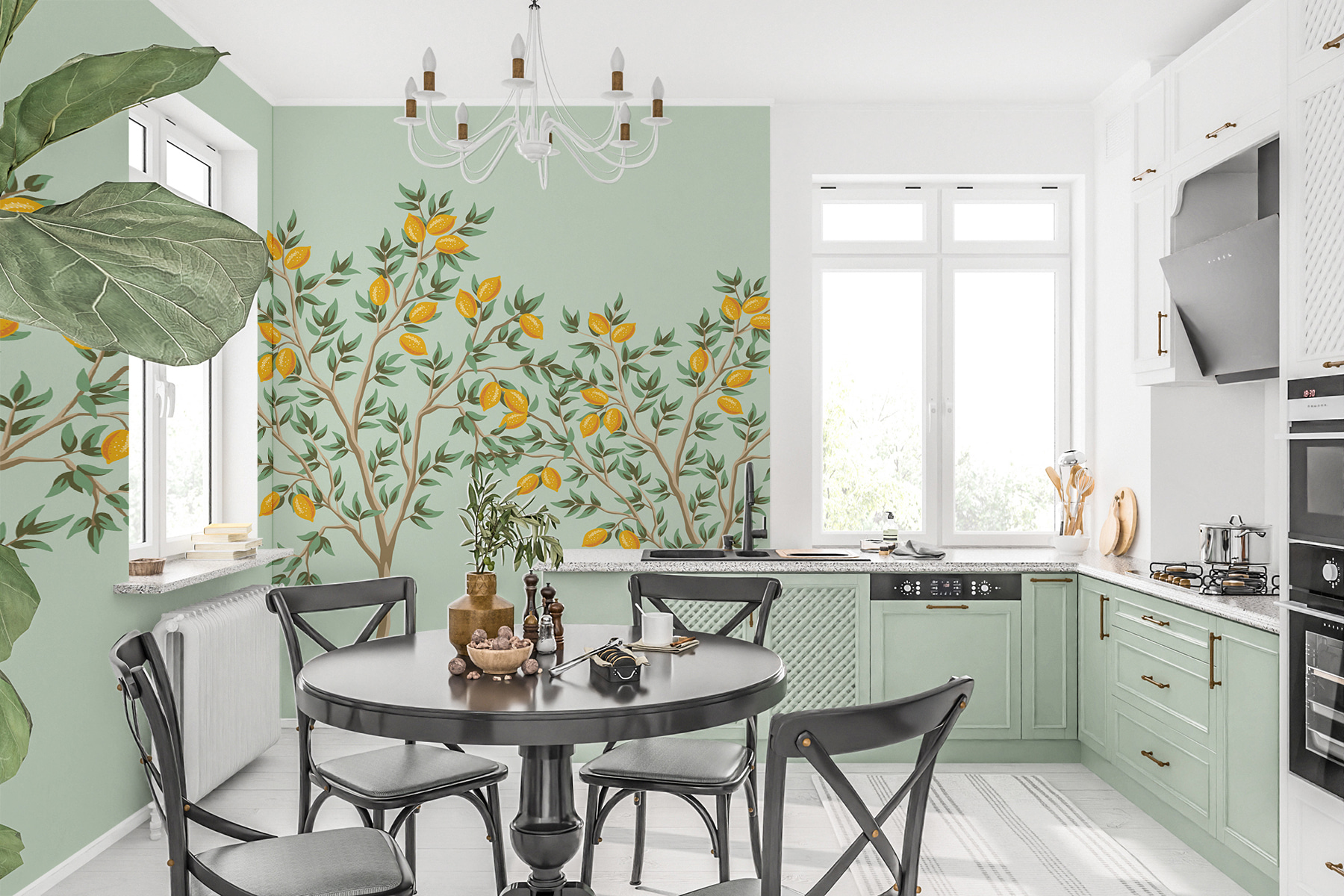 Transform your space with this delightful mural featuring a tree bursting with yellow fruits. It’s like bringing a piece of nature indoors, where those vibrant fruits are just waiting to add a splash of cheer. Imagine sipping your morning coffee surrounded by the lush greenery—it’s practically a mini escape to a sunny orchard. This design not only brightens the room, but it also sparks conversations. Guests might ask if you have a secret garden. Perfect for kitchens or living rooms, it’ll surely charm anyone who walks by. Bring a subtle touch of warmth and whimsy to your home.