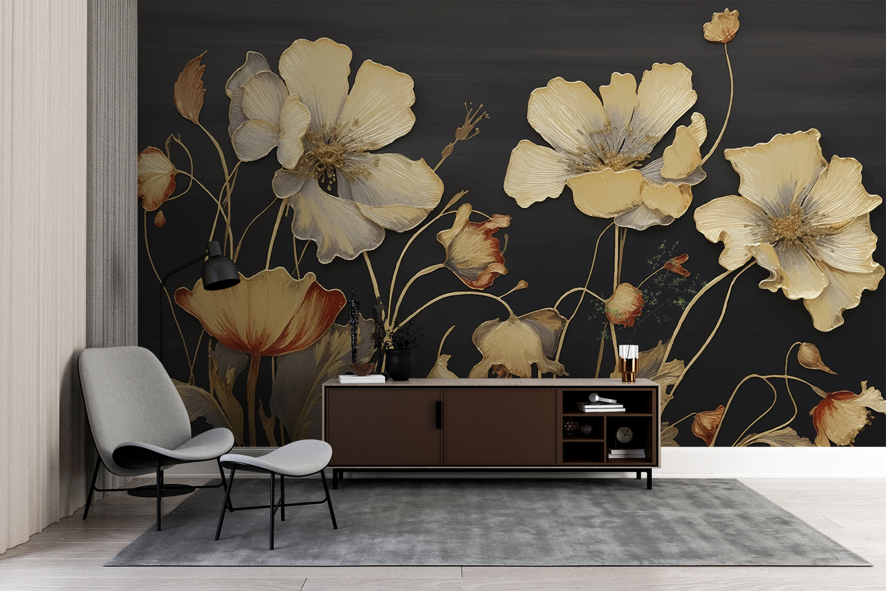 Transform your space with the “Elegant Blossoms on Dark Backdrop” mural, where dreamy flowers dance against a rich, dark canvas. Imagine walking into a room that feels like a cozy hideaway, bursting with a quiet charm that’s both modern and timeless. The soft tones of gold and muted colors bring a touch of sophistication, while that dark backdrop? Perfect for making these blooms pop like they’re ready for a night out. Just picture sipping tea, surrounded by this gorgeousness—instant calm. It’s not just decor; it’s a whole vibe, perfect for sparking conversations or simply enjoying a moment of peace. Whether it’s a living room or a serene bedroom, these blossoms will have your walls humming with life.