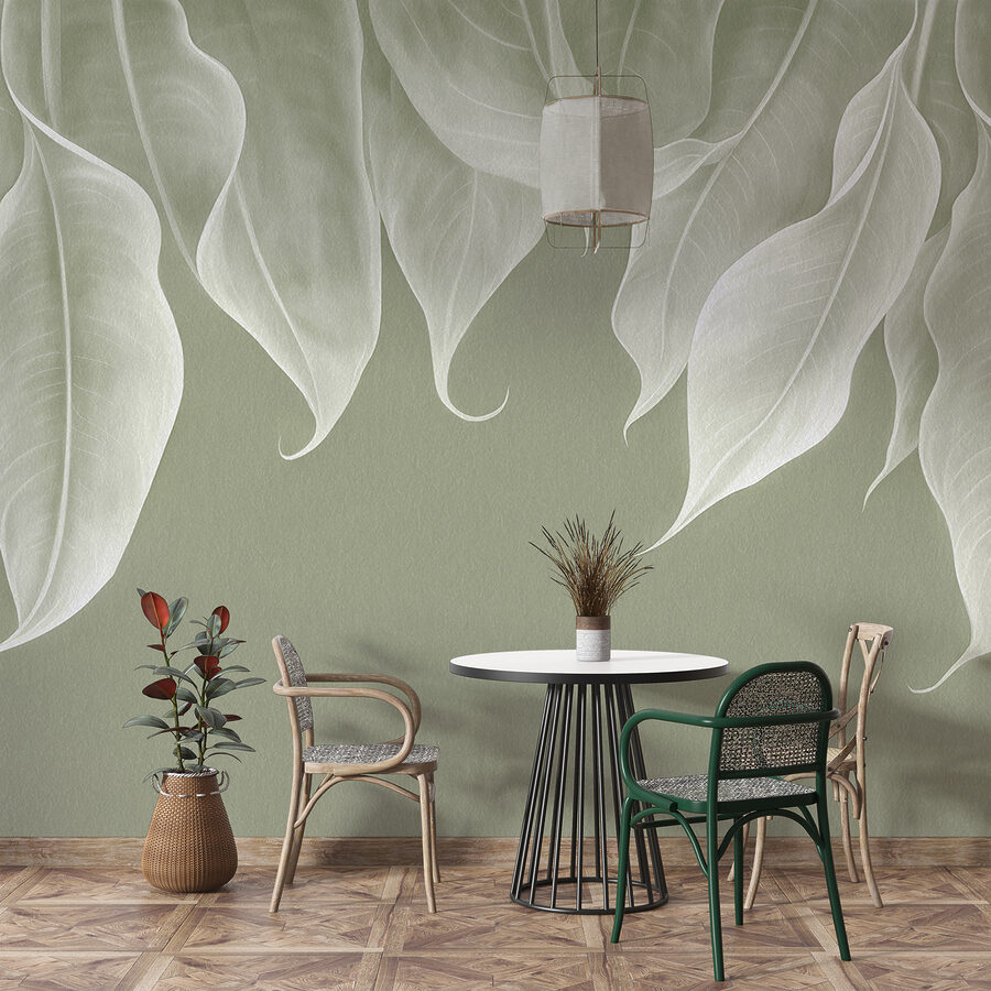Transform any room into a tranquil oasis with “Elegant Waves of Monochrome Foliage.” This mural whispers sophistication, featuring delicate leaf designs that seem to float effortlessly, perfect for a cozy reading nook or a whimsical living room. Imagine sipping tea while surrounded by these gentle waves of nature, almost like having a private garden on your wall. The subtle greens and soft whites create a calming vibe—ideal for unwinding after a hectic day. Plus, it’s a conversation starter! Friends might just think you’ve got a secret connection to an artist. Who wouldn’t love that?