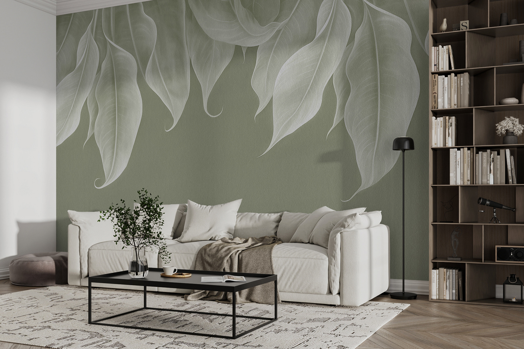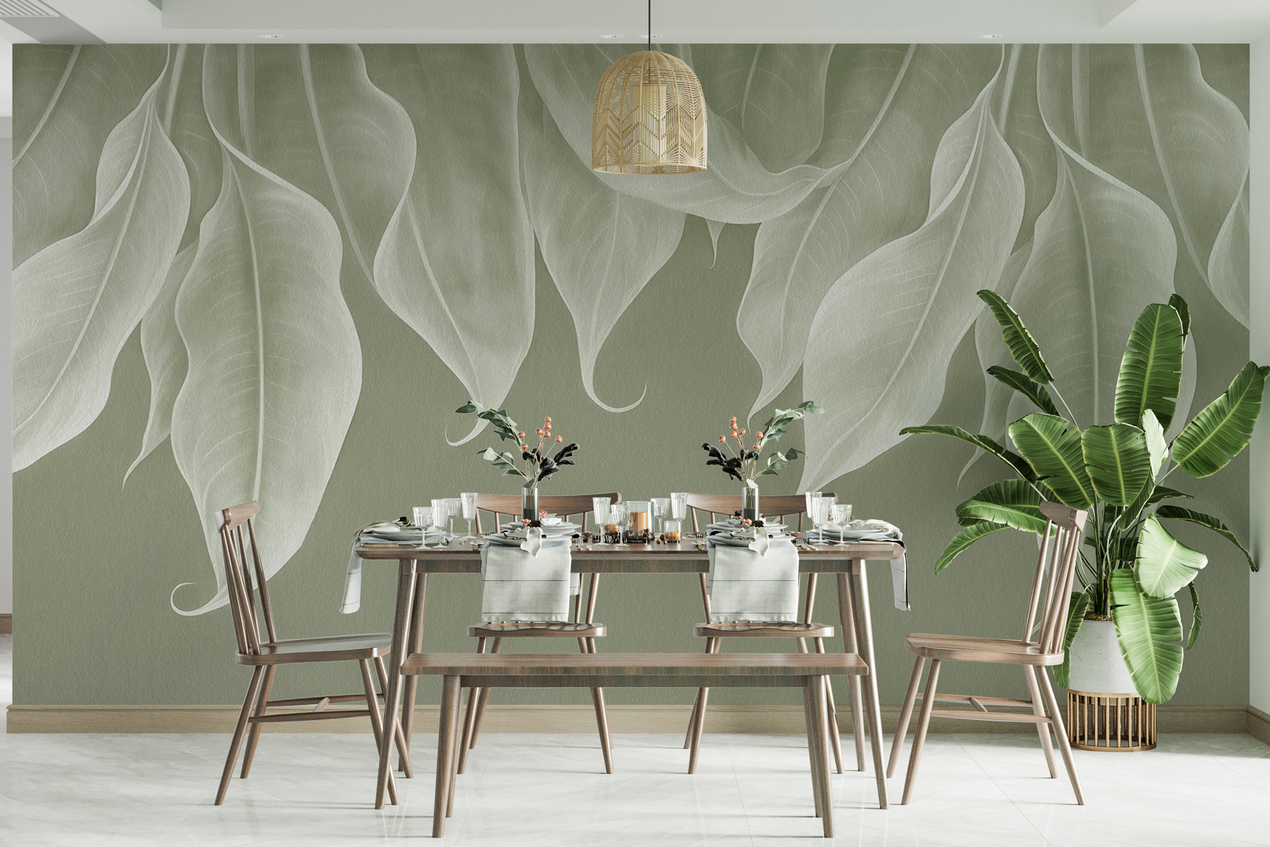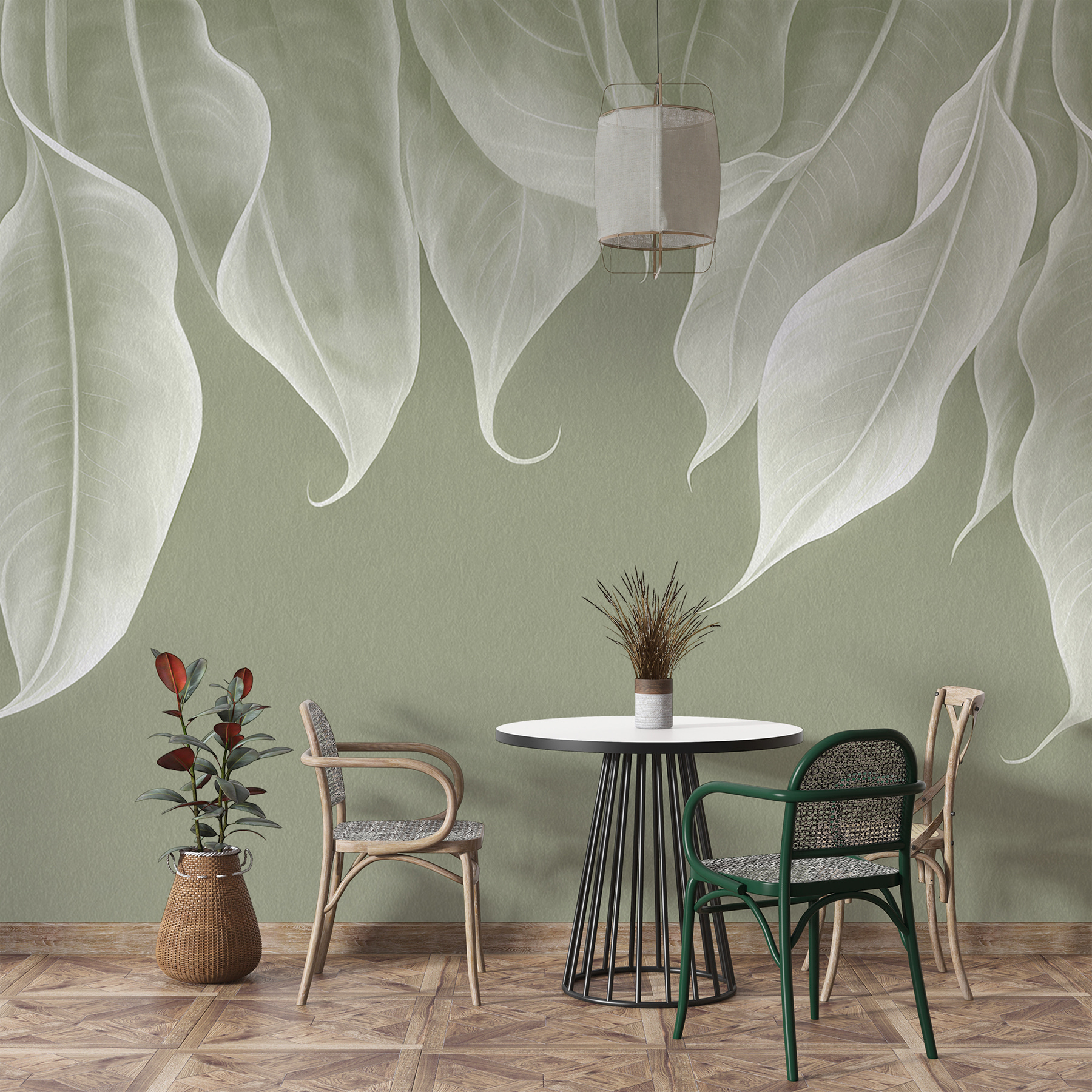 Transform any room into a tranquil oasis with “Elegant Waves of Monochrome Foliage.” This mural whispers sophistication, featuring delicate leaf designs that seem to float effortlessly, perfect for a cozy reading nook or a whimsical living room. Imagine sipping tea while surrounded by these gentle waves of nature, almost like having a private garden on your wall. The subtle greens and soft whites create a calming vibe—ideal for unwinding after a hectic day. Plus, it’s a conversation starter! Friends might just think you’ve got a secret connection to an artist. Who wouldn’t love that?