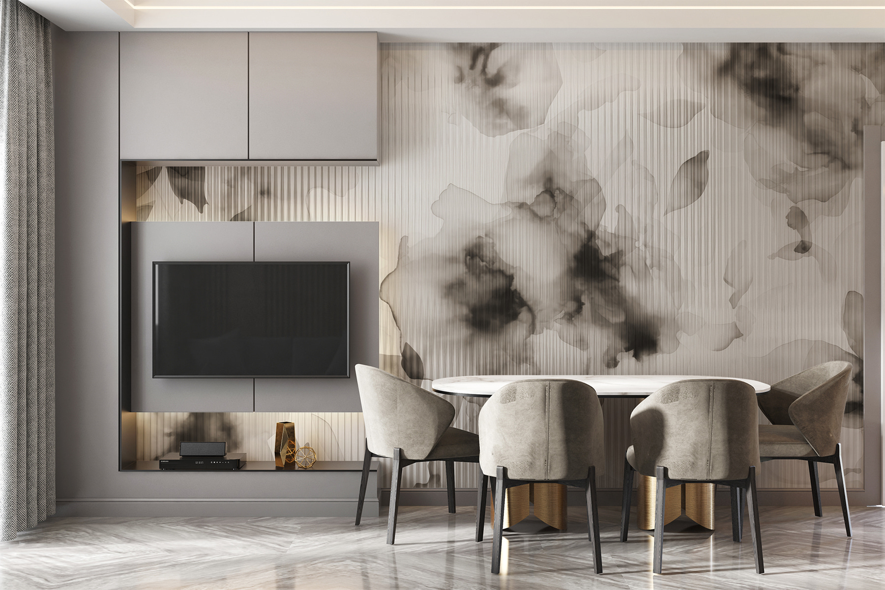 The vinyl coating is a thin layer of PVC applied to a non-woven base. The presence of vinyl makes the wallpaper resistant to damage, allows for easy cleaning with a damp sponge, and gives the surface an embossed texture, resembling linen fabric.