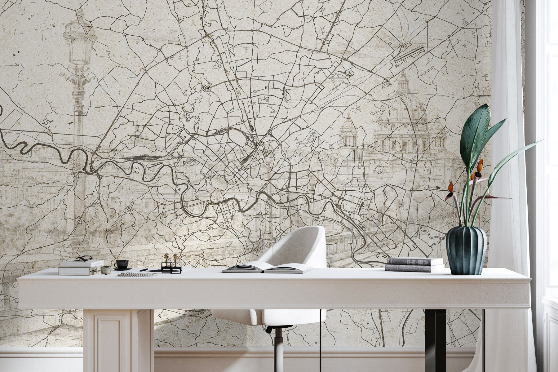 The muted tones blend perfectly with any decor, making it an ideal backdrop for lazy afternoons or creative brainstorming sessions. Feel a little nostalgia? Perhaps it reminds you of a favorite trip or a dream yet to be explored. This mural whispers tales of exploration and the beauty of the city—perfect for those who appreciate the journeys life takes. Who knew a simple wall could spark so many daydreams?