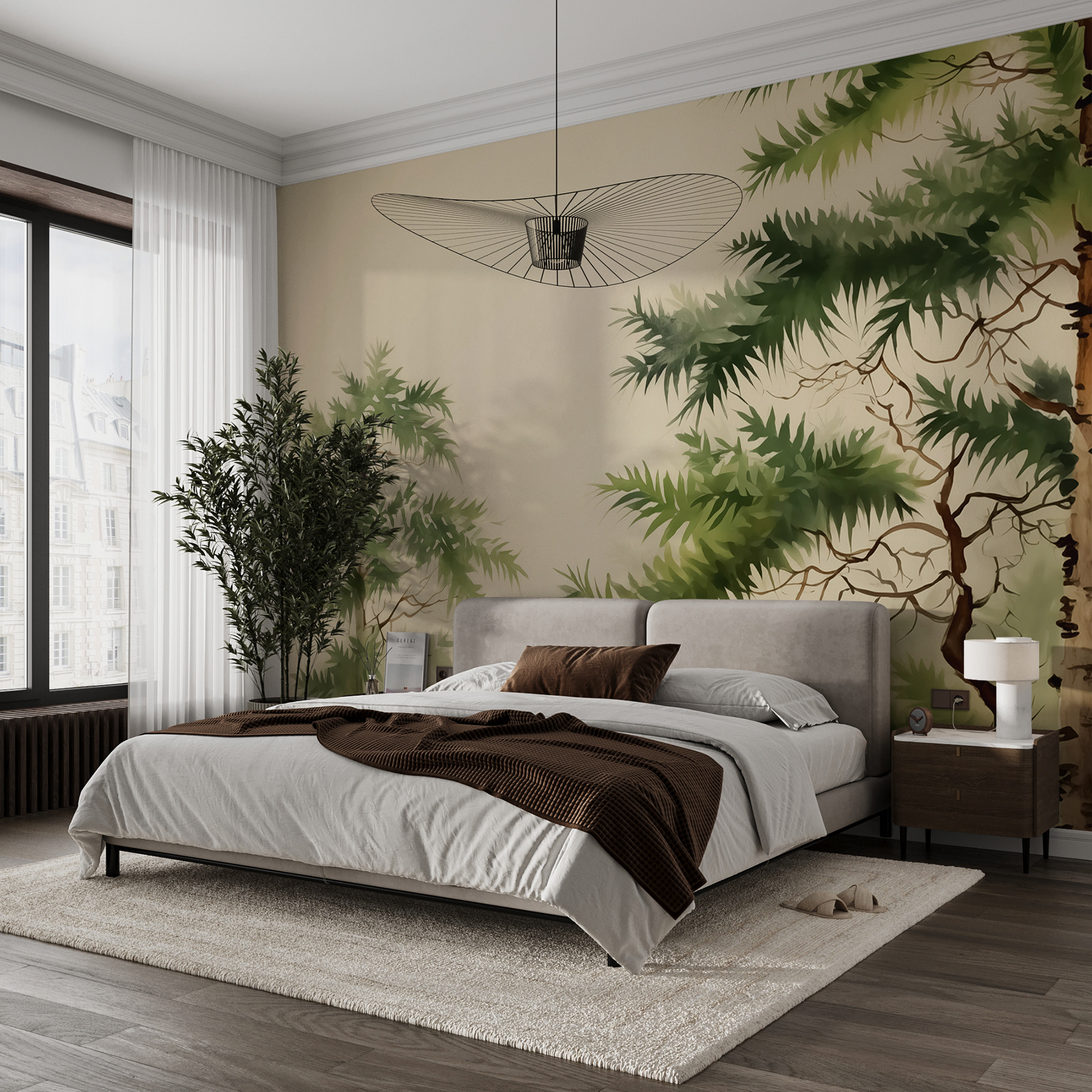 Transform any room into a serene forest escape with this stunning mural of trees shrouded in soft fog. It invites you into a tranquil world, almost like a gentle whisper from nature itself. Picture waking up to this calming scenery—just imagine sipping coffee while staring at those lush greens, feeling a little more grounded with each sip. Perfect for making a statement without overwhelming the space, it adds a touch of whimsy and warmth. Plus, it’s a great reminder that sometimes a little bit of nature can brighten even the dullest days. Welcoming and comforting, this mural’s gentle hues create a cozy vibe that makes you want to settle in and enjoy life.