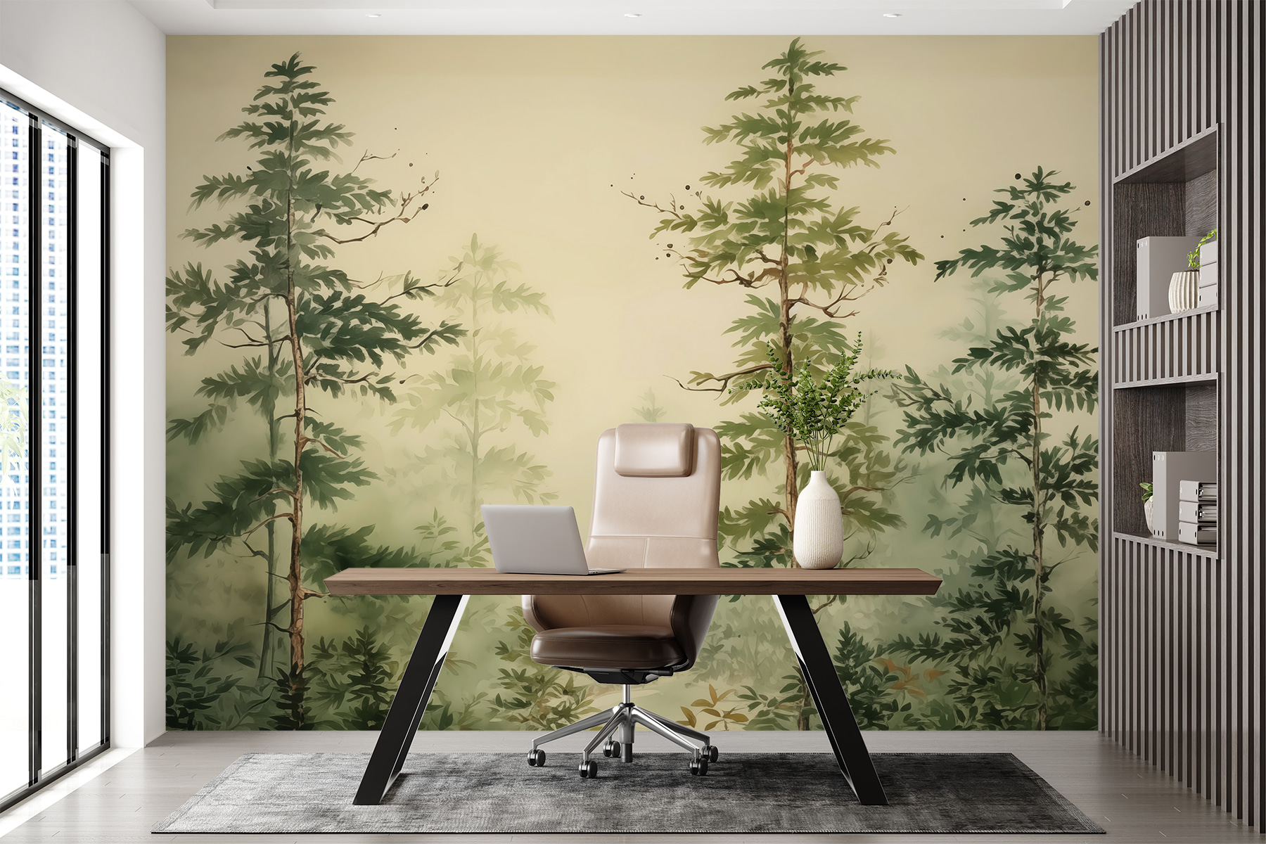 Transform any space with this enchanting “Wall Murals Painting of a Forest.” Imagine stepping into a lush woodland every time you walk into the room. Those tall, leafy trees create a perfect escape, almost like nature’s calling you for a walk—just without the bugs! This mural blends soothing greens with dreamy mist, giving off that serene vibe.