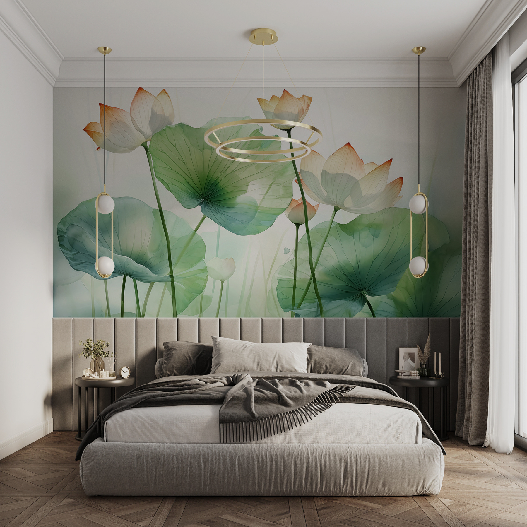 Transform your space with the enchanting “Lotus Blooms in Serene Waters” mural. Imagine stepping into a calming oasis, where graceful lotus flowers float serenely, evoking dreamlike tranquility. The soft greens and delicate pinks create a peaceful vibe—perfect for any room that could use a little zen.