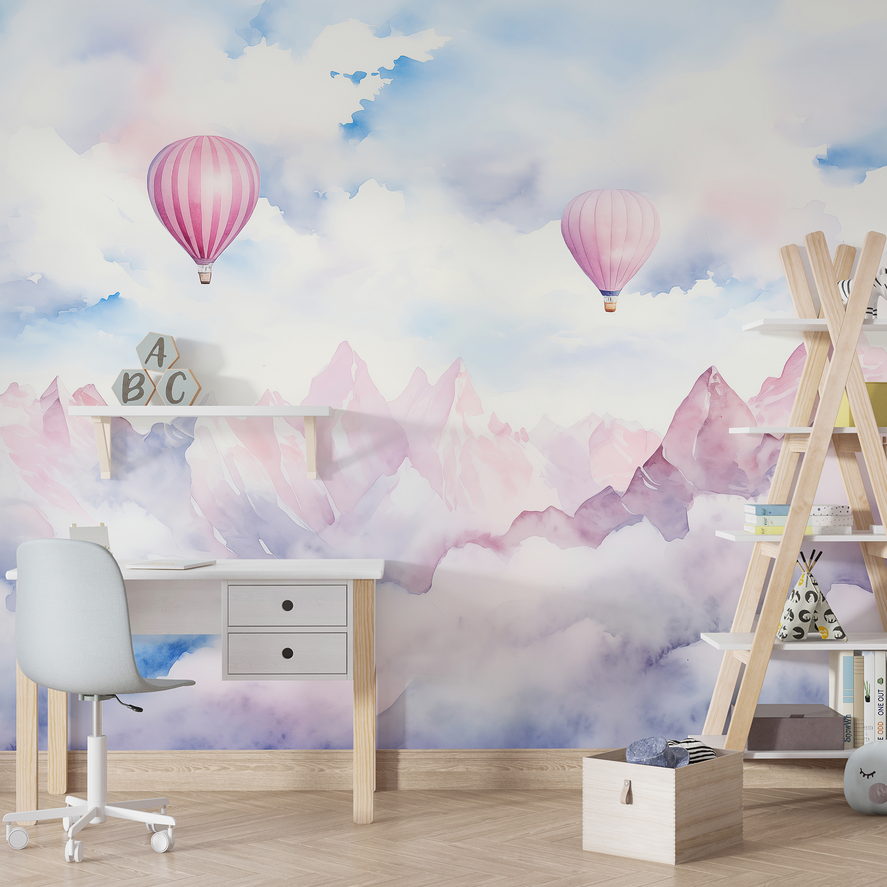 Transform any room into a dreamy escape with this whimsical mural featuring hot air balloons gliding over a sea of fluffy clouds. Picture it: you walk into your space, and boom! You’re instantly whisked away to a tranquil sky where everything feels lighter. The delicate pink hues of the balloons are just begging for a soft breeze, while the misty mountains add that touch of adventure. It’s the perfect backdrop for cozy chats or daydreaming—maybe even conjuring up thoughts of spontaneous trips! Who wouldn’t want to float up there, if only in spirit? This mural isn’t just decoration; it’s an invitation to pause, breathe, and let your imagination take flight. A little bit of magic can go a long way.