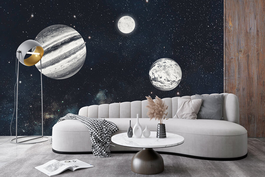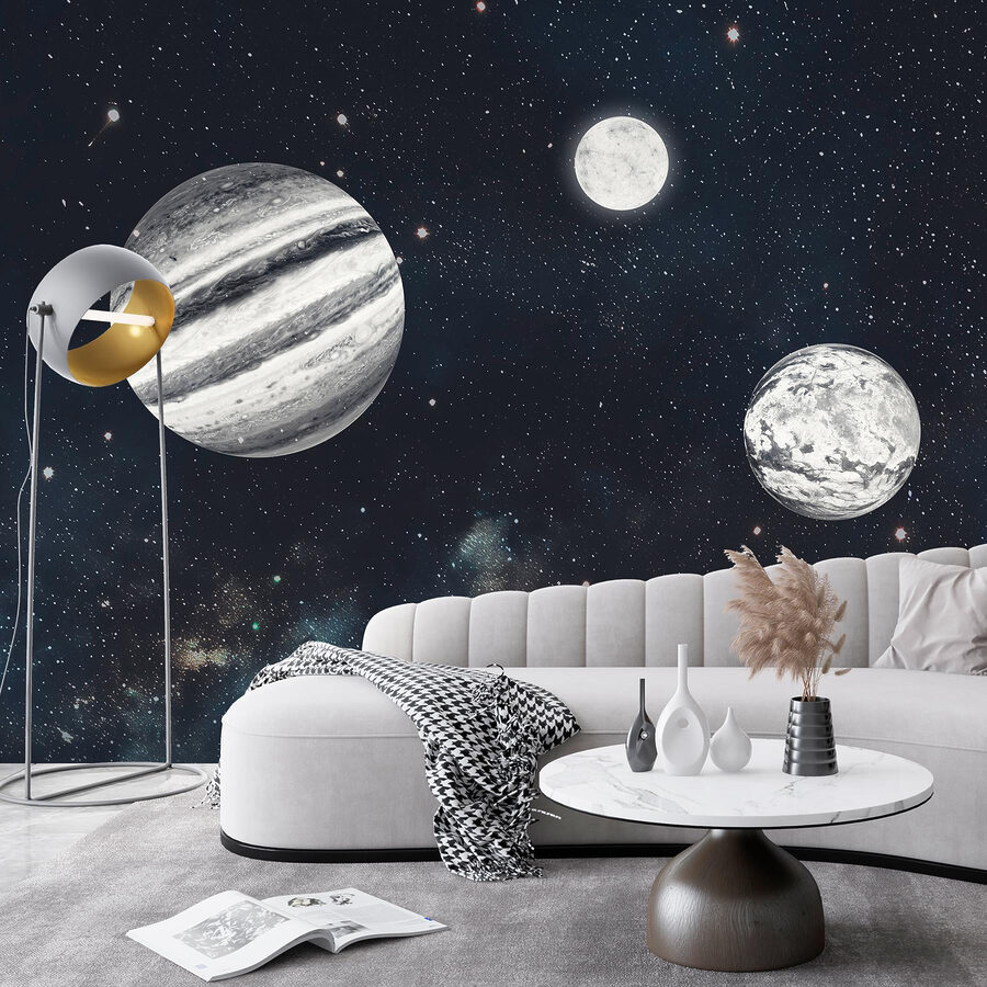 Transform your space into a cosmic escape with this stunning wall mural featuring planets in the vastness of space. Imagine strolling into your room and feeling like you’ve just stepped onto a spaceship—Jupiter, the Moon, and all those twinkling stars right at your fingertips! The deep black backdrop feels almost like a warm embrace, inviting daydreams about far-off galaxies. Perfect for those who love a bit of cosmic wonder in their lives, it’s like bringing the universe home. It’s not just decor; it’s a conversation starter—and who doesn’t want to chat about the mysteries of the cosmos over coffee? A little adventure for your walls!