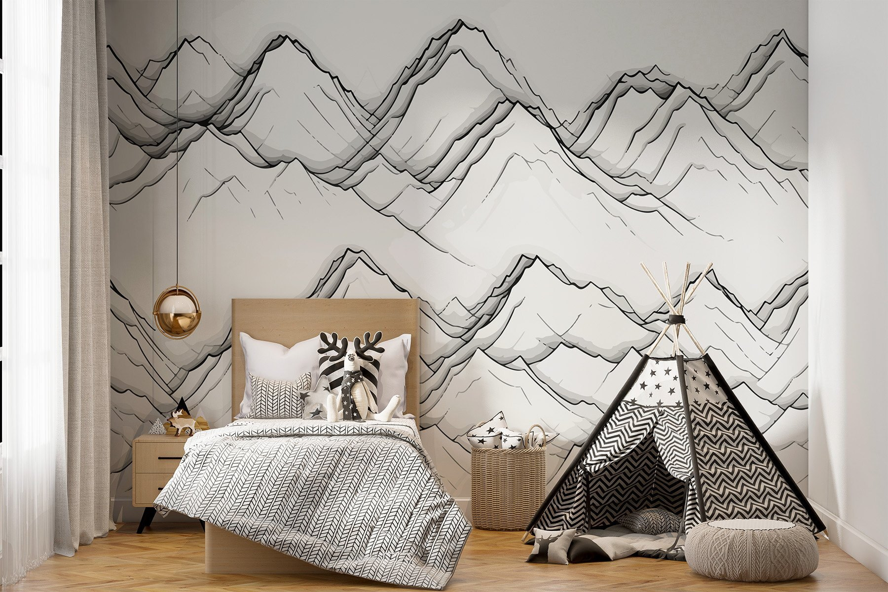 Transform your space with this stunning wall mural featuring a dreamy drawing of mountains. It’s the kind of design that whispers adventure, perfect for those who wish they could just pack a bag and head into the wild. The soft, flowing lines create an almost meditative vibe, making it easy to zone out after a long day. Imagine sipping coffee in a cozy nook surrounded by these ethereal peaks—seriously, who wouldn’t feel a little more inspired? Whether it’s in a living room or home office, it’s like having a piece of nature right at your fingertips. Plus, no hiking boots required!