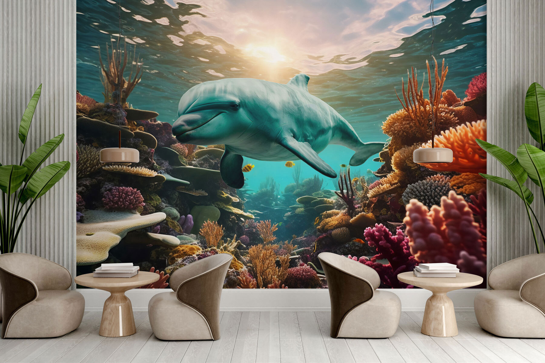 Bring the ocean to your walls with this vibrant mural featuring a dolphin gracefully swimming among colorful corals. Imagine the breezy feel of a seaside escape right in your living room. The dolphin, with its playful demeanor, acts like a charming guest welcoming everyone to a day of adventure. It’s easy to picture friends gathering, smiles all around, as the conversation flows just like water. And those lively corals? They could make anyone feel like they’re submerged in a tropical paradise, where every glance transports you to sparkling blue waters. Perfect for a brightening touch in any space.