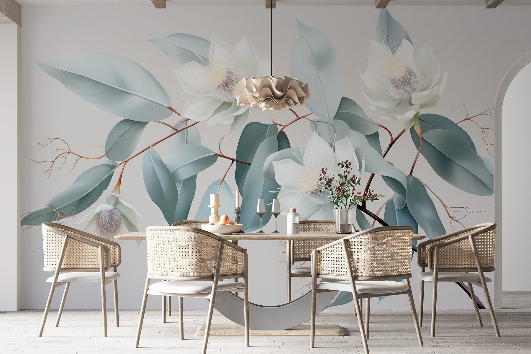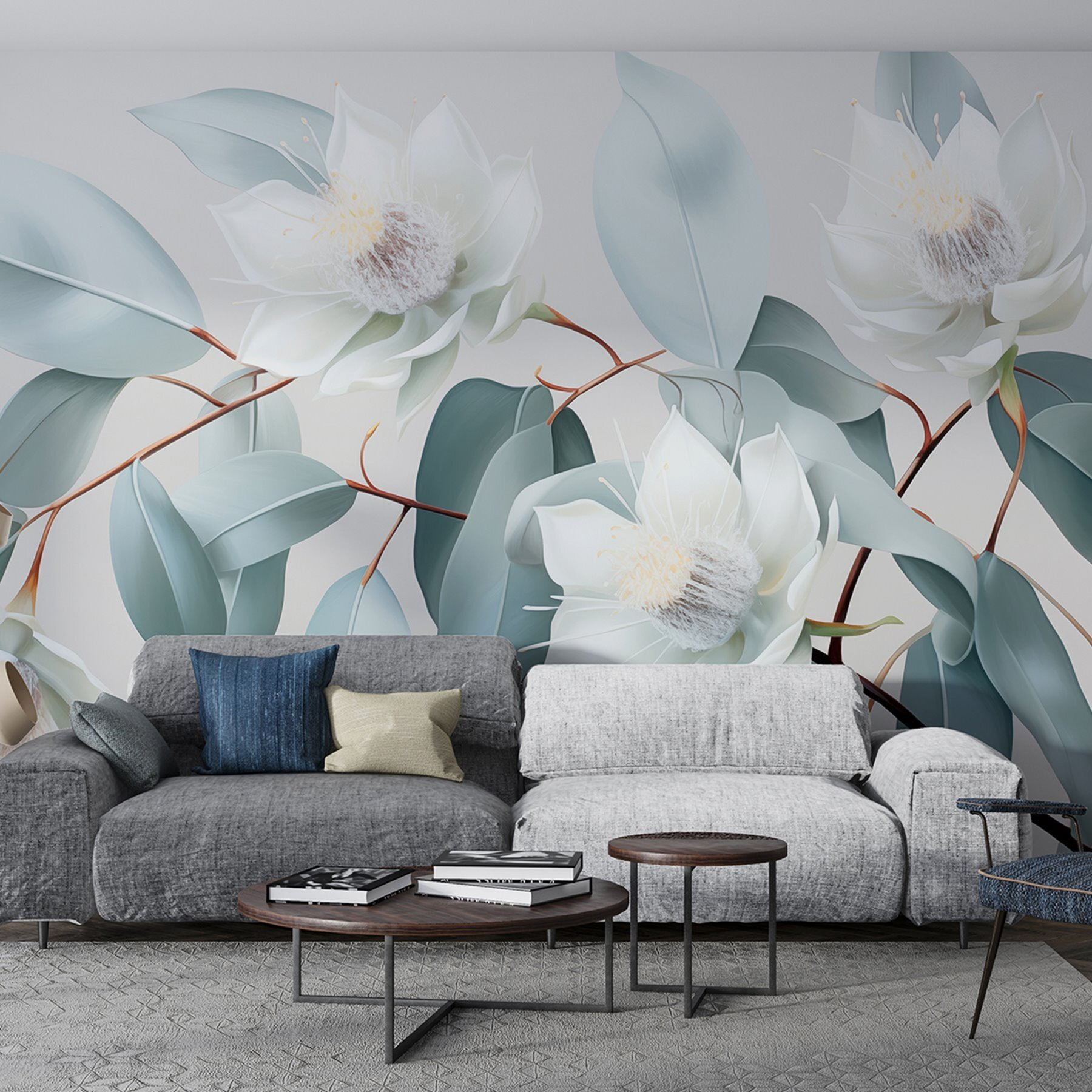 Transform any space with the stunning “Wall Murals White Flowers and Leaves on a Branch.” This mural wraps your walls in an elegant embrace of soft whites and gentle greens, reminiscent of a serene garden. Imagine stepping into your room and feeling as if you’ve been transported to a peaceful oasis, where the daily grind fades away.