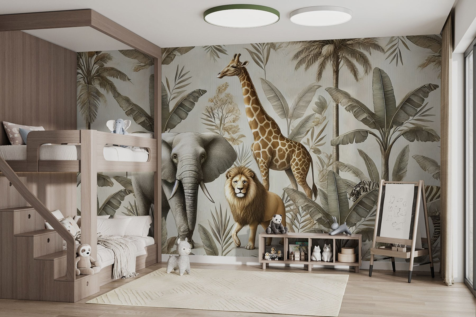 Transform your space into an exotic retreat with this stunning wall mural featuring a vibrant assembly of wildlife. Picture it: elephants trumpeting, giraffes peeking over the treetops, and a lion strutting his stuff like he owns the place. It’s like having a miniature safari right in your living room!