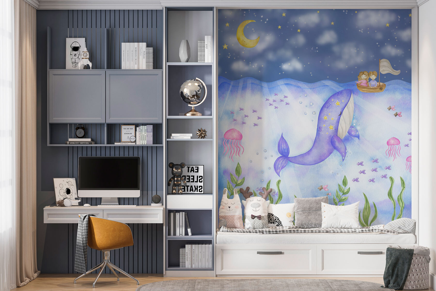 Dive into a whimsical underwater world with this charming wall mural featuring a playful whale and vibrant jellyfish. It captures a serene moment beneath the waves, where fantasy dances with reality. Imagine the soft blue hues bringing calm vibes to any room—perfect for a child’s space or a cozy nook. Picture little ones staring wide-eyed, dreaming of ocean adventures amidst the stars. The gentle bubbles and playful sea life create a sense of wonder, making it a conversation starter. Hang it up and watch as your walls transform into a storybook scene!