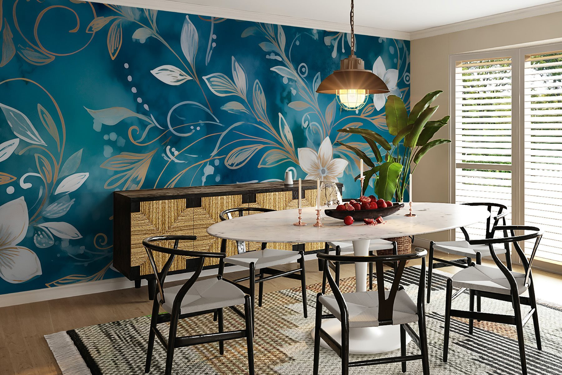 Transform any space with the “Serene Floral Design on Blue” wall mural. Imagine stepping into a room where delicate white flowers dance against a calming blue backdrop. It’s like bringing a slice of nature indoors, but without the pollen allergies! The intricate swirls and hints of gold add a touch of elegance, making it perfect for a cozy reading nook or a lively living room. Picture friends chatting over coffee, surrounded by this serene beauty—definitely a conversation starter. Plus, it’s a refreshing pop of color that’s sure to lift anyone’s spirits. Who wouldn’t want to feel like they’re lounging in a peaceful garden every day?
