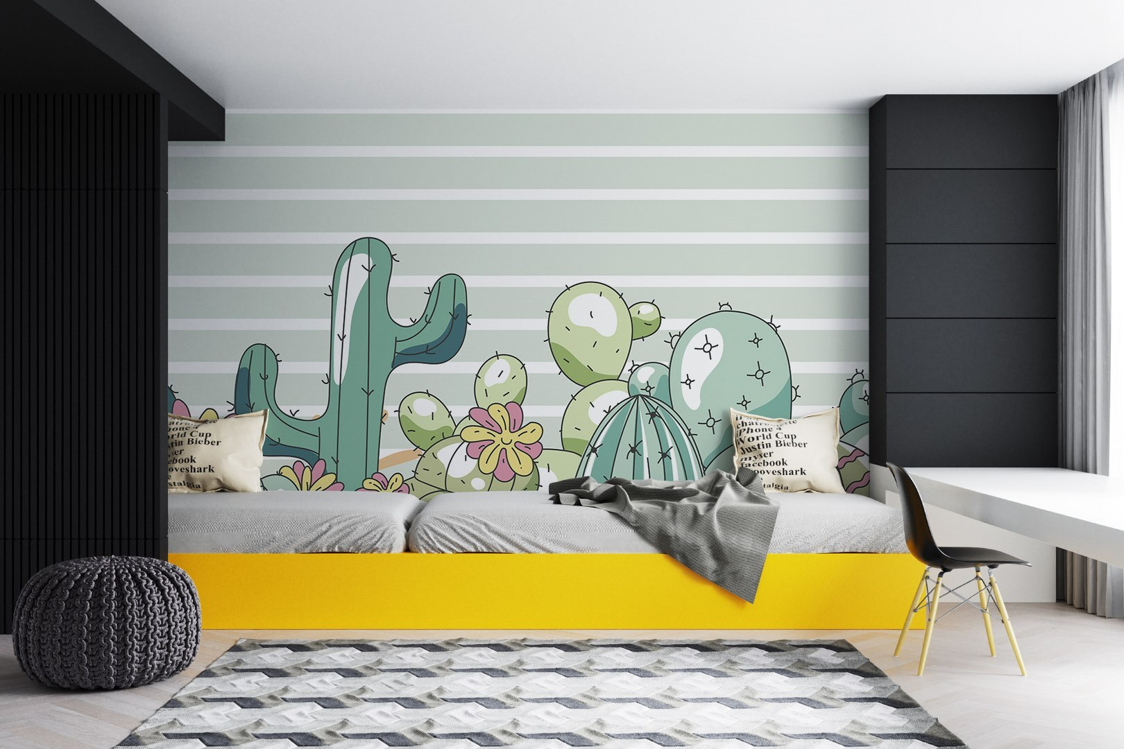 Transform any space with this delightful wall mural featuring a lively group of cactuses adorned with charming flowers. It’s like inviting a little piece of the desert right into the room. Imagine walking in and being greeted by those playful plants, adding a splash of color and whimsy to the walls. Perfect for children’s rooms or anywhere that needs a bit of cheer, this mural sparks imagination and joy. With its soft tones and cheerful vibes, it’s sure to make everyone smile—who wouldn’t love a cactus party? Just watch out for those prickly friends!