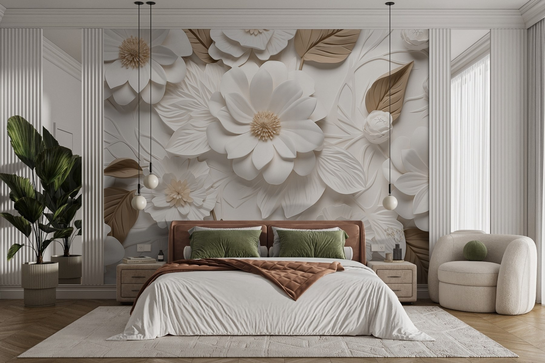 Transform any room with this stunning wall mural featuring crisp white and warm brown flowers, paired with delicate leaves. It’s like bringing a serene garden indoors, minus the pollen! Imagine sipping coffee in a space that feels like a tranquil retreat—soft textures that almost beg to be touched, and hues that soothe the soul. This mural isn’t just decoration; it’s a gentle reminder to breathe and enjoy life’s little moments. Perfect for living rooms, bedrooms, or even cozy nooks where ideas blossom. Trust me, it’s hard not to smile every time you walk by!
