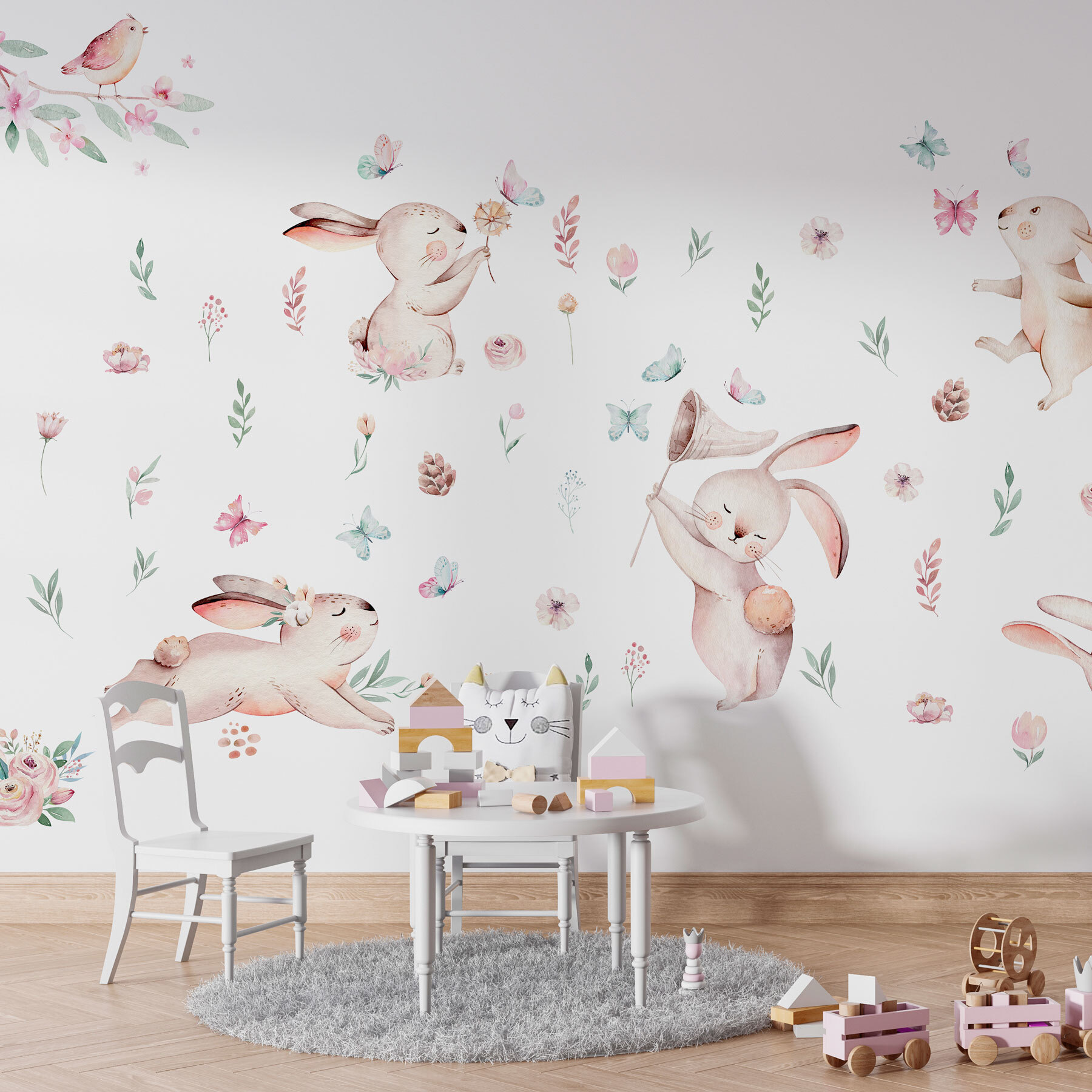 Bring a touch of whimsy to any room with the “Group of Rabbits with Flowers and Butterflies” mural. Imagine hopping into a world where playful bunnies frolic among soft blooms and fluttering butterflies. It’s like a charming storybook sprang to life on your wall! Perfect for a nursery or a cozy corner, this mural adds a splash of joy and warmth. Picture little ones giggling as they spot the bunnies or unwinding in a space that feels just a bit more magical. Who wouldn’t want a daily reminder of nature’s simple joys? Plus, it might even inspire daydreams of outdoor adventures—chasing butterflies, anyone? Embrace a bit of flower-child spirit in your home!