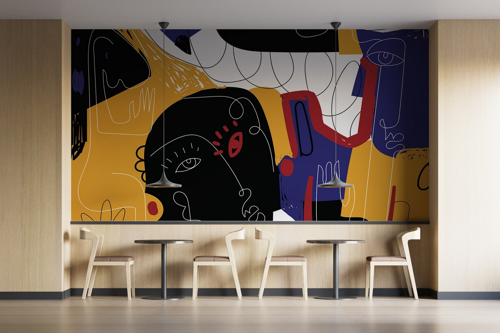 Transform any space with this eye-catching mural, “Wall Murals Colorful Art with Black and Blue Faces.” It’s like a vibrant conversation starter right on your wall, blending bold colors and abstract faces that dance in a delightful chaos. Imagine stepping into a room and being greeted by these expressive figures, each telling their own quirky story. The pops of black and blue against warm yellows can sprinkle a bit of joy and intrigue into your living area—or that quiet corner needing a splash of personality. Perfect for those who love art that sparks imagination, it adds a dash of modern charm that’ll have guests nodding with approval. Plus, there’s something so fun about art that seems to look right back at you—like it’s got its own personality!