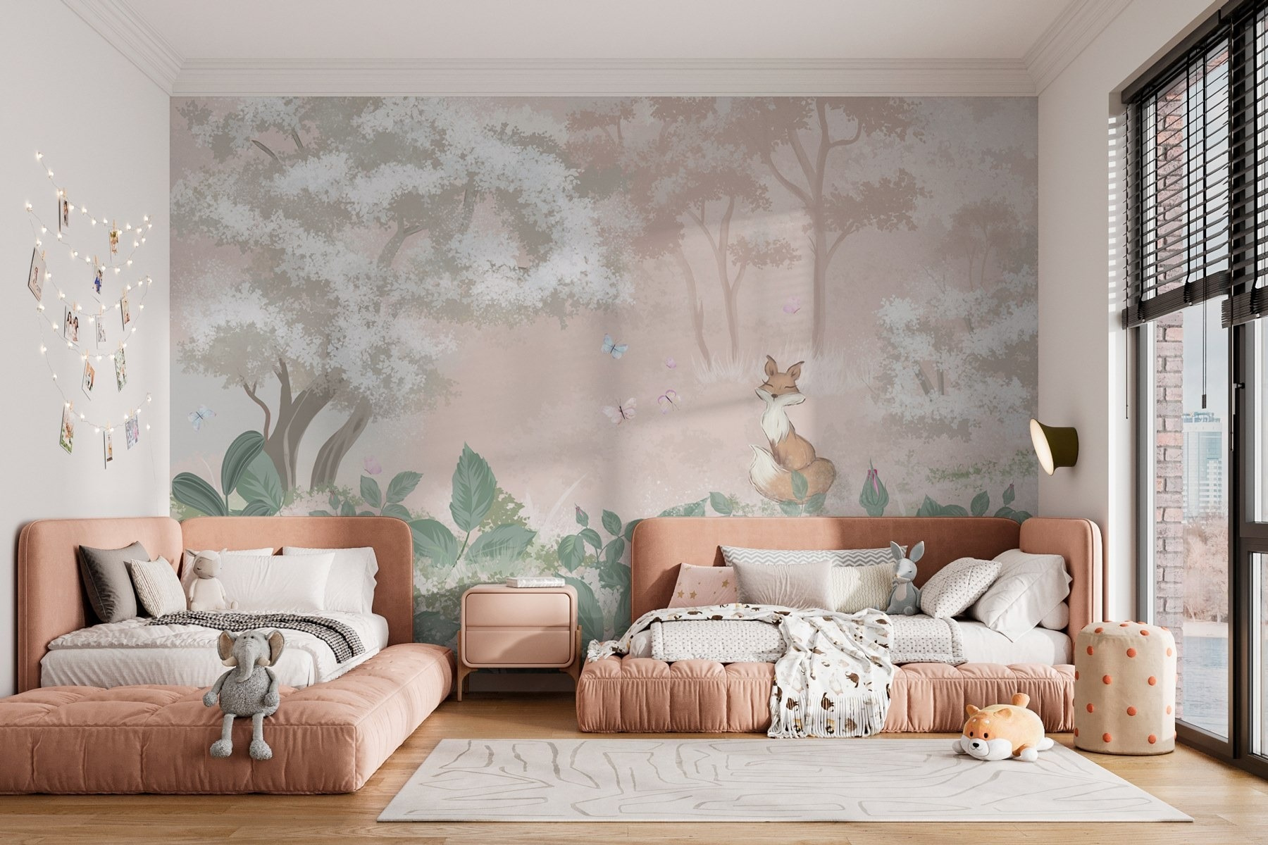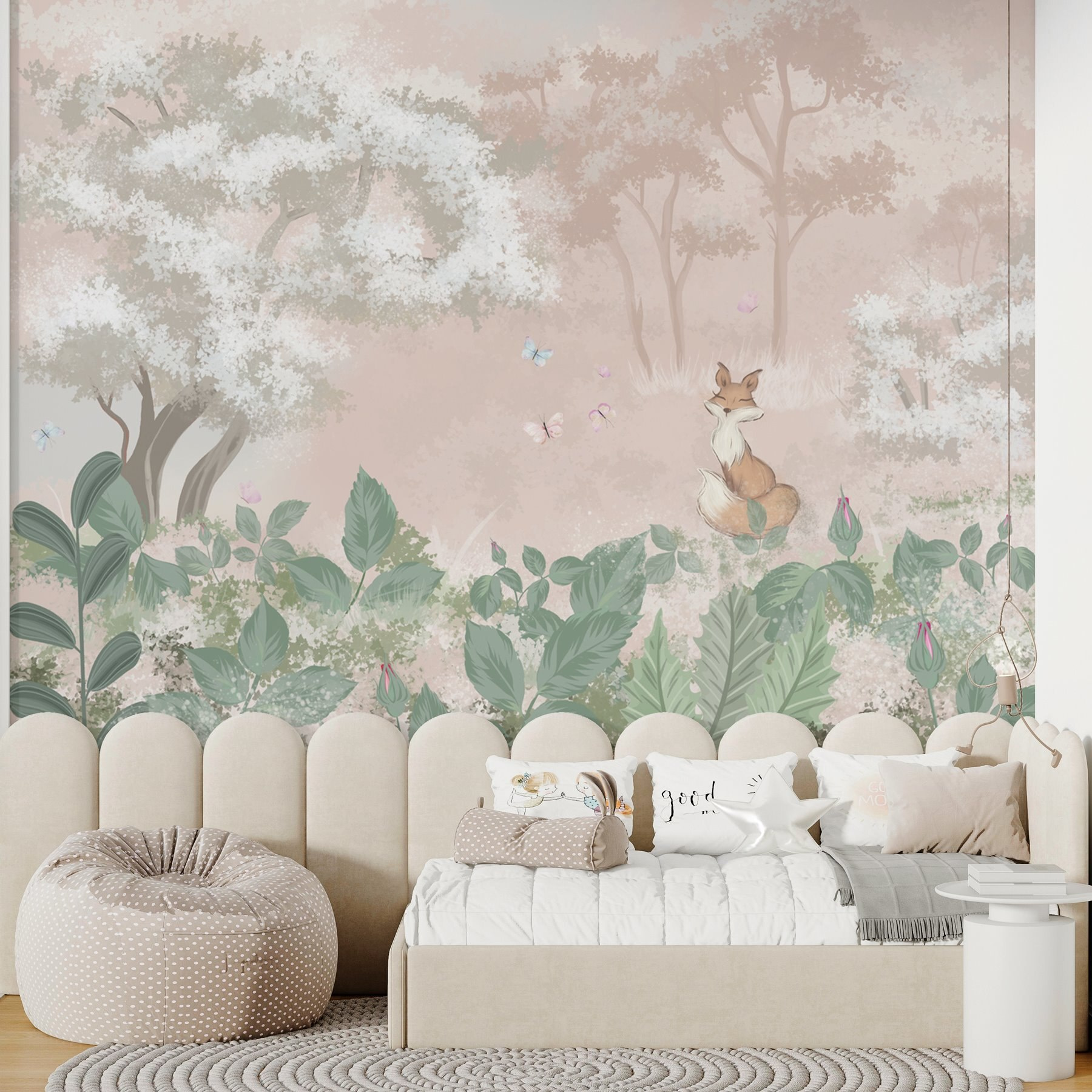 Transform your space with the enchanting “Fox and Butterflies in a Forest” mural. Imagine stepping into a whimsical woodland, where a curious fox surveys delicate butterflies dancing in the air. It’s not just a wall; it’s a mini getaway right in your room! The soft pastel colors wrap you in calm, making even the busiest days feel a tad more serene. Perfect for a cozy reading nook or a playful kids’ room, this mural sparks imagination and adds a touch of nature’s charm. Who wouldn’t feel a bit more inspired here? Just picture it—a cup of tea in hand, lost in a good book, with this fabulous backdrop. A delightful feast for the eyes!