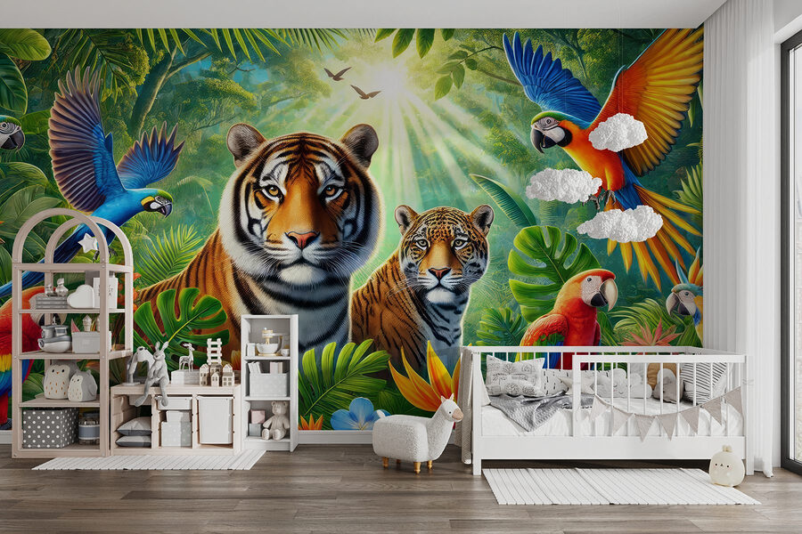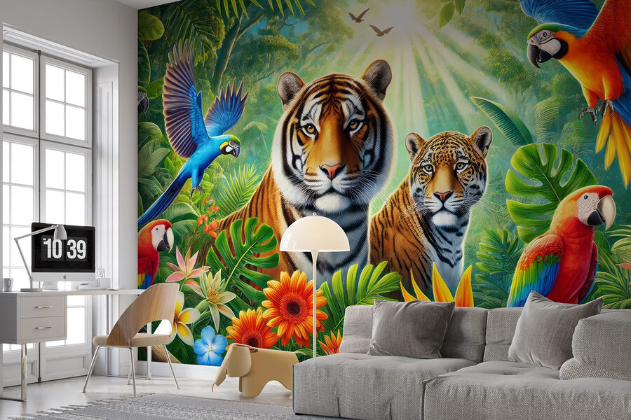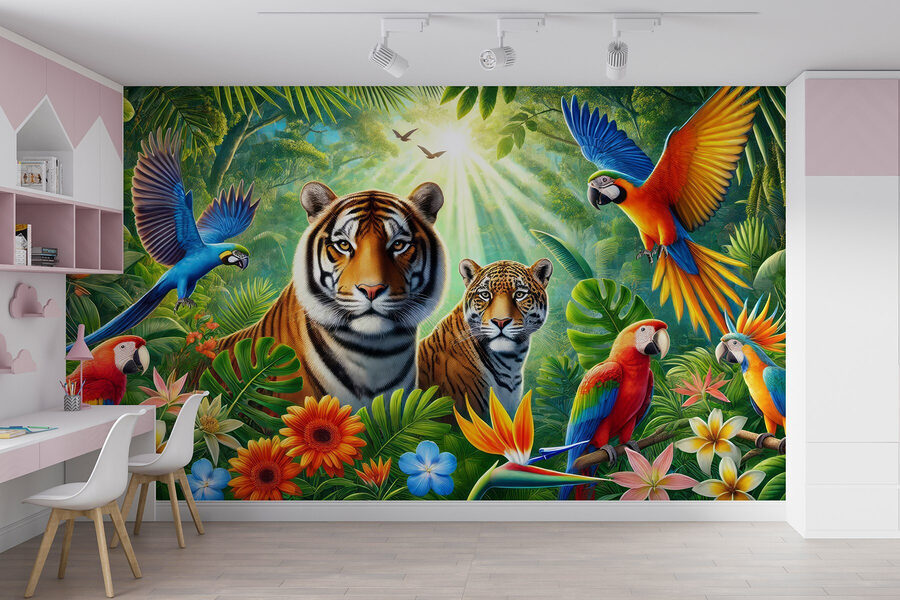 Step into your very own jungle with this vibrant wall mural! Imagine a space filled with the lush greenery of the tropics, where playful parrots dive through the air and majestic tigers keep watch. This isn’t just decoration; it’s an invitation to experience nature indoors. Picture curling up with a book, surrounded by these stunning colors and textures. It sparks joy, creativity, and maybe even a little wanderlust. Perfect for cozy corners or lively playrooms, this mural adds a splash of adventure—no hiking boots required!