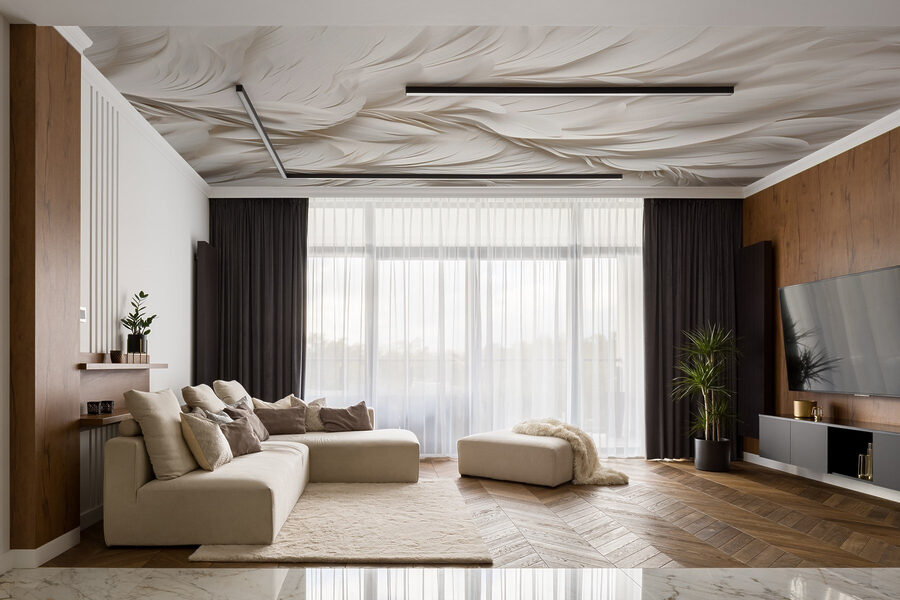 The vinyl coating is a thin layer of PVC applied to a non-woven base. The presence of vinyl makes the wallpaper resistant to damage, allows for easy cleaning with a damp sponge, and gives the surface an embossed texture, resembling linen fabric.