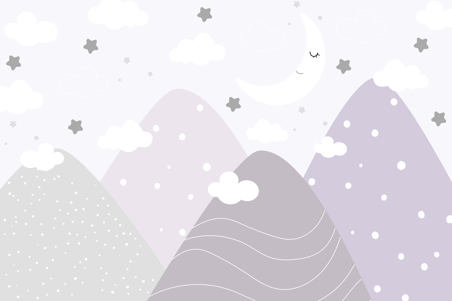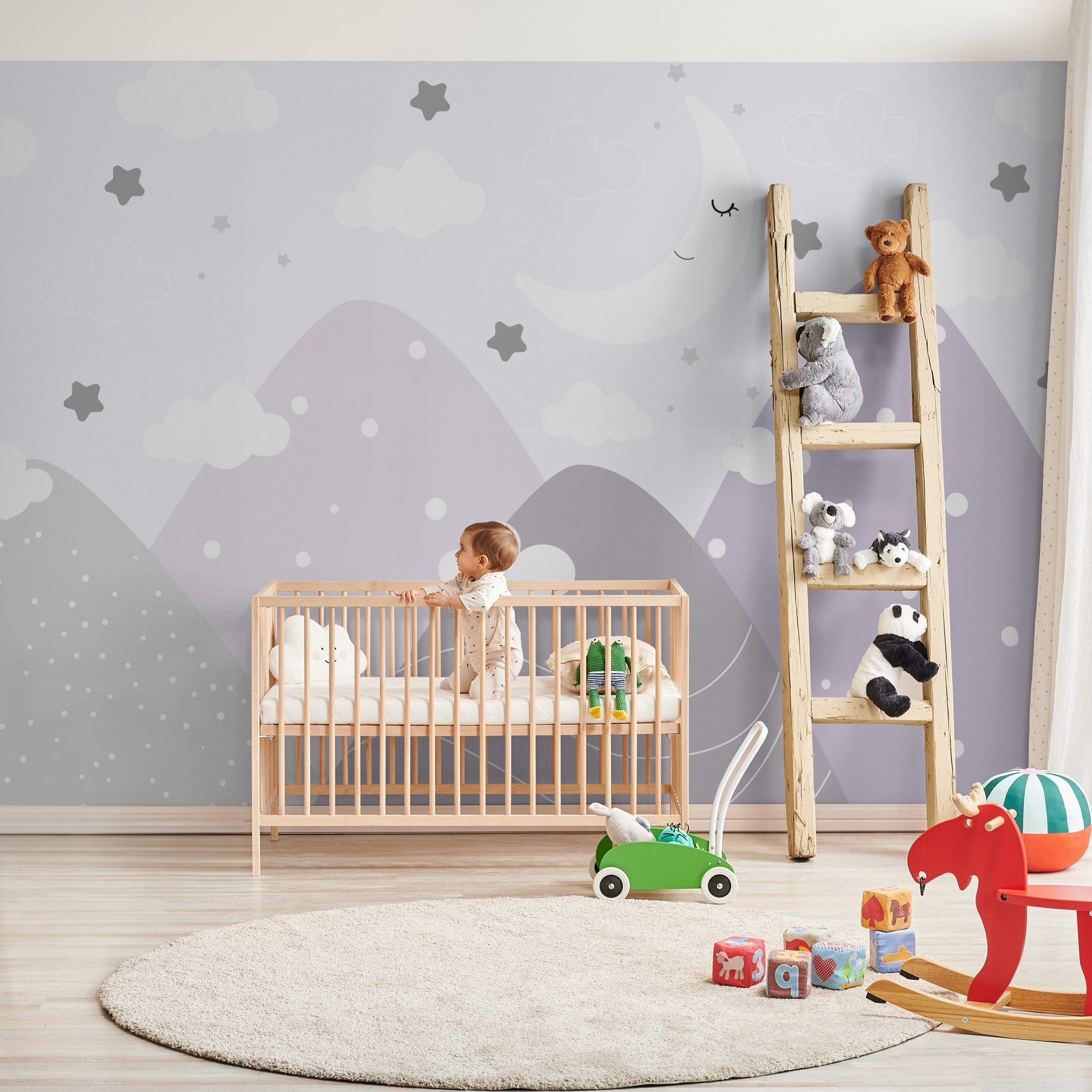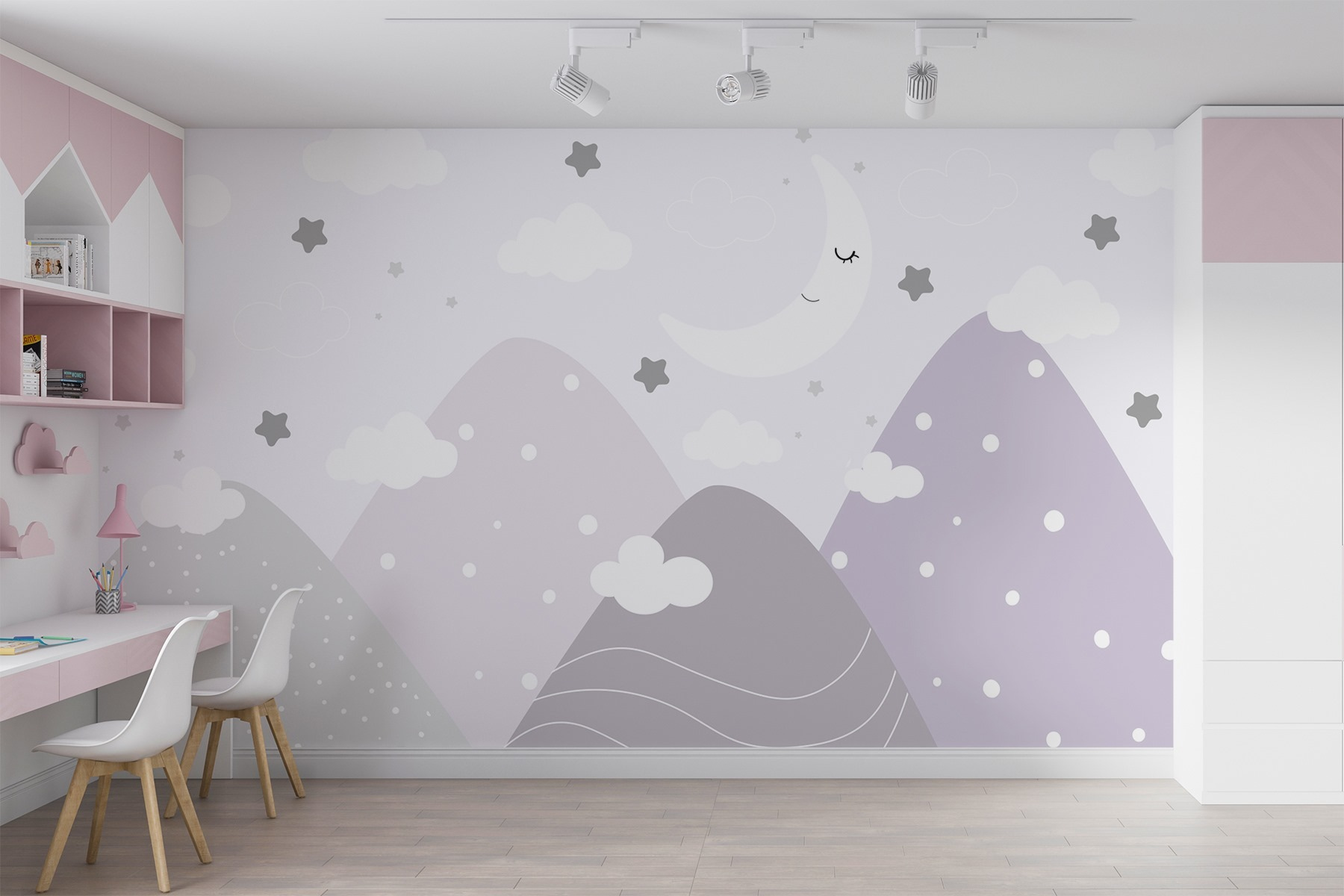 Transform your space with this dreamy wall mural featuring a whimsical moon nestled among playful clouds. Picture it: charming mountains in soft hues of gray and lilac, sprinkled with twinkling stars that seem to blink just for you. It’s like inviting a piece of the night sky right into your home! Perfect for kids’ rooms, nurseries, or even just to add a touch of fun to any wall, this mural sparks imagination. Imagine bedtime stories told under its gentle gaze, creating cozy moments filled with wonder. It’s not just decor—it’s an experience waiting to fill your walls with joy!
