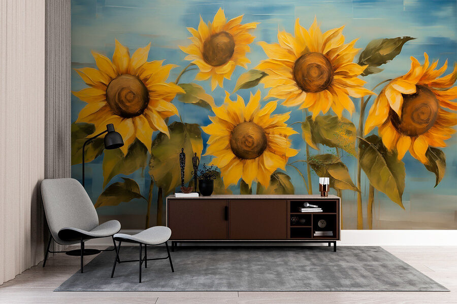 Brighten up any room with this stunning mural of sunflowers, like a sunny day captured on your wall. Imagine walking into your space and instantly feeling that warm, cheerful vibe. Each sunflower practically bursts with personality, standing tall and proud against a soothing blue backdrop, just begging for a compliment.