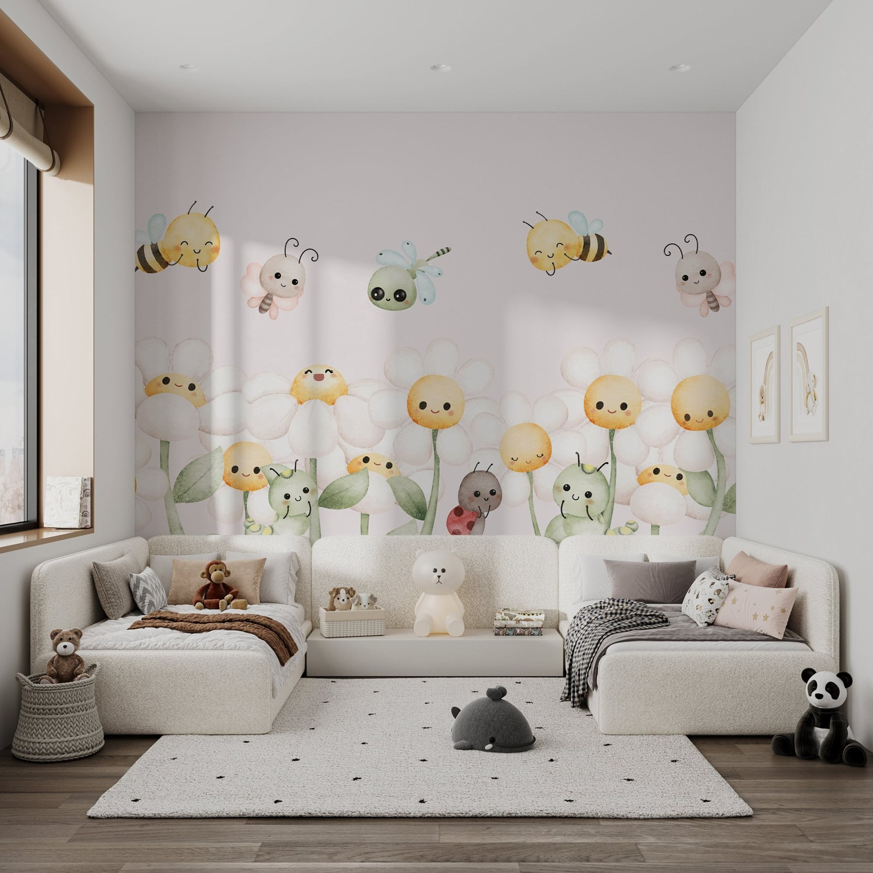 Transform your space into a whimsical wonderland with this delightful mural featuring a playful group of cartoon bugs and cheerful flowers. Just imagine strolling into a room that feels like a sunny garden—where ladybugs smile and bees buzz cheerfully. It’s like inviting nature inside without the pesky pollen! Kids will giggle and adults can’t help but smile. Perfect for nurseries, playrooms, or even a cozy reading nook. Each charming character is ready to bring a sense of joy and a sprinkle of innocence. This mural isn’t just decor; it’s a daily dose of happiness!