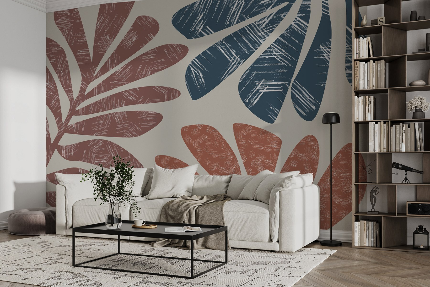 Transform your space with this stunning wall mural featuring bold and vibrant leaf patterns. It’s like bringing a piece of nature indoors, minus the insects. Just imagine walking into a room drenched in these earthy tones—those coppery reds and deep blues really pop against the soft background. It’s a feast for the eyes. Perfect for a cozy reading nook or a lively dining area, this mural invites warmth and creativity. Guests will feel relaxed and inspired, maybe even a little adventurous. You might find yourself daydreaming about lush jungles or serene gardens. Seriously, the vibe it creates? Absolutely magical.