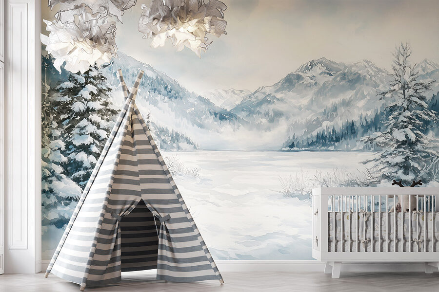 Transform any room into a cozy winter wonderland with this stunning wall mural, “Snowy Landscape with Trees and Mountains.” Picture this: soft, powdery snow blankets serene trees while majestic mountains loom in the background. It’s like having a piece of tranquil nature right in your home.