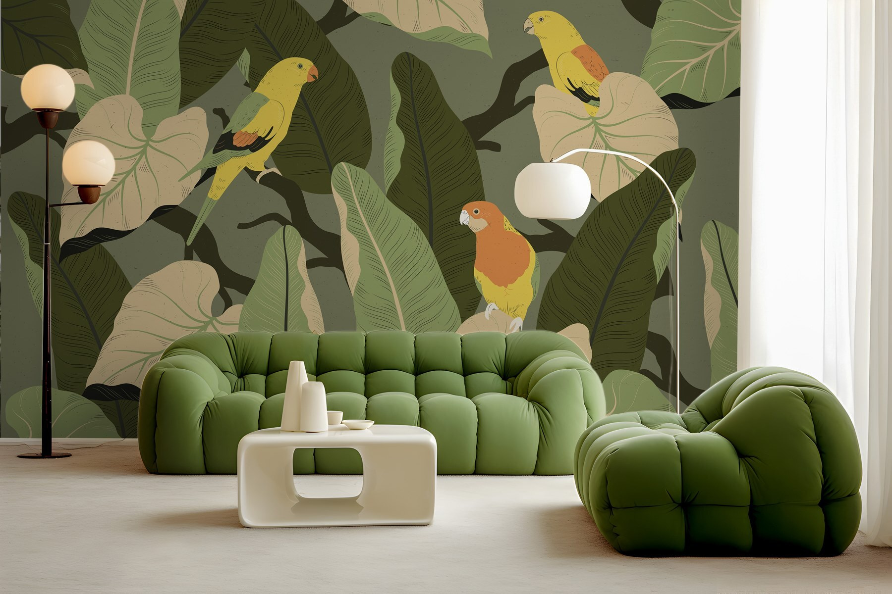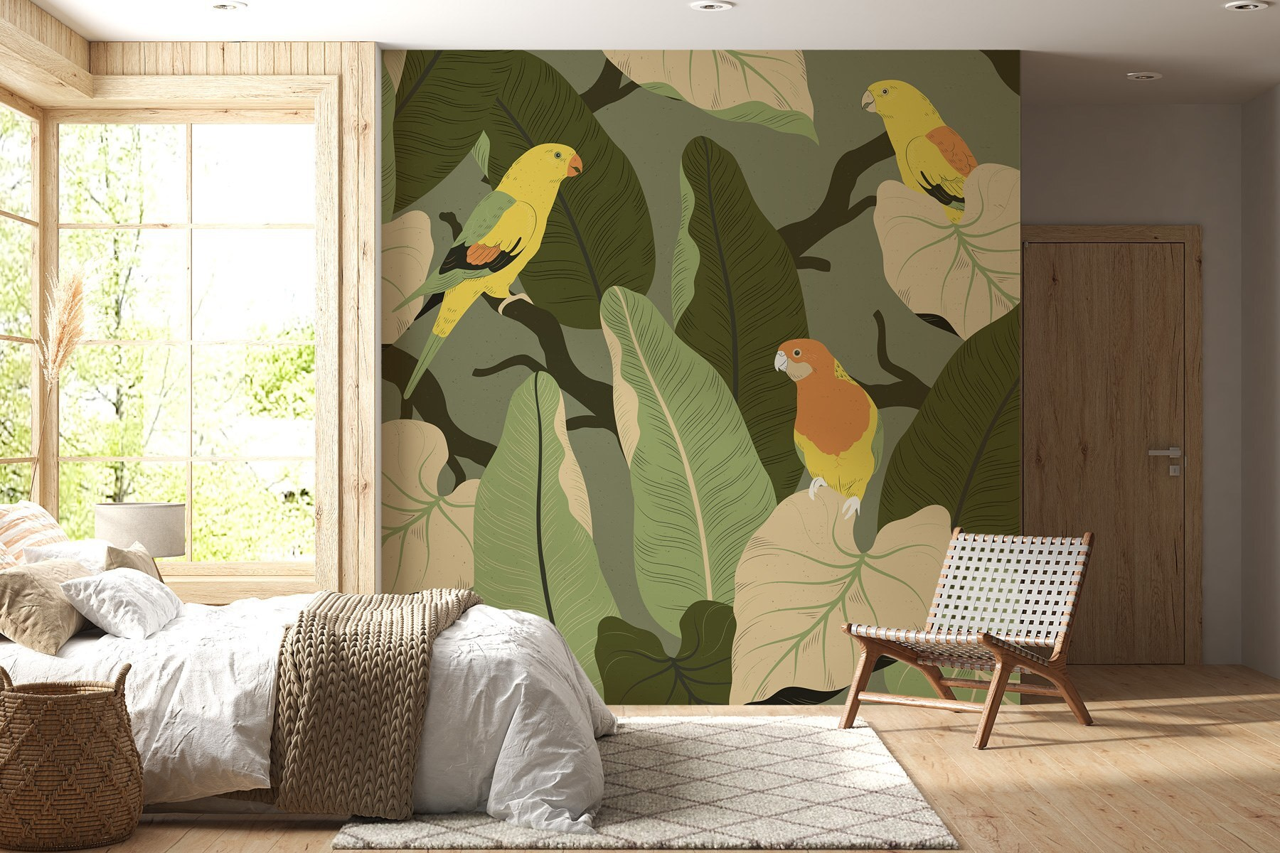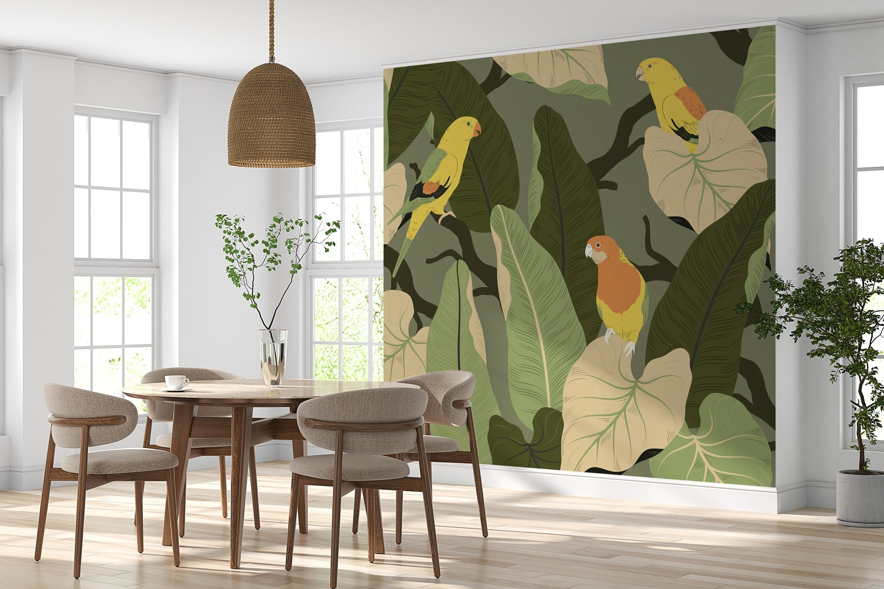 Imagine stepping into a room where vibrant birds seem to chirp right off the wall! This mural, featuring colorful feathered friends perched among lush leaves, adds a burst of nature’s charm to any space. It’s like bringing a slice of a tropical paradise indoors—perfect for daydreaming or a cozy chat over coffee. The playful colors can brighten a dull wall, making it feel alive. Whether it adorns a living room, bedroom, or even a little nook, it invites warmth and creativity. It’s not just decor; it’s nature’s happy vibe, just hanging out with you! Who wouldn’t feel a little uplifted surrounded by these cheerful winged pals?