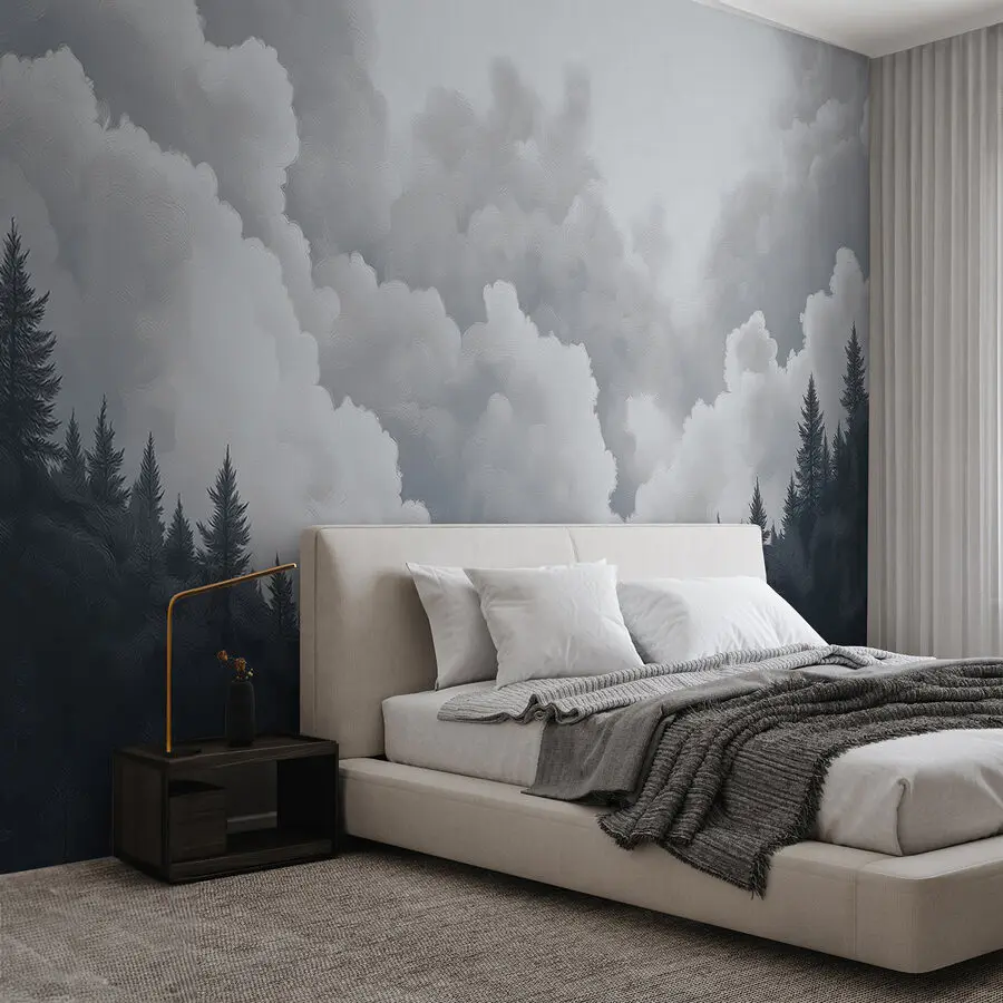 Transform your space with the mesmerizing “Group of Trees and Clouds” mural, where nature meets artistic flair. Picture this: a cozy nook suddenly comes alive, with dark silhouettes of towering evergreens set against a dreamy, cloud-filled sky. It’s like having a piece of the great outdoors right inside your home—without the bugs! The gentle interplay of shadows and light feels calming, perfect for those chill evenings with a cup of tea. Friends might stop by, stare in awe, and ask if you’ve turned your living room into a woodland retreat. Just imagine the stories that could unfold here—snuggled up with a book or catching up with loved ones. It’s more than decor; it’s an experience waiting to happen!