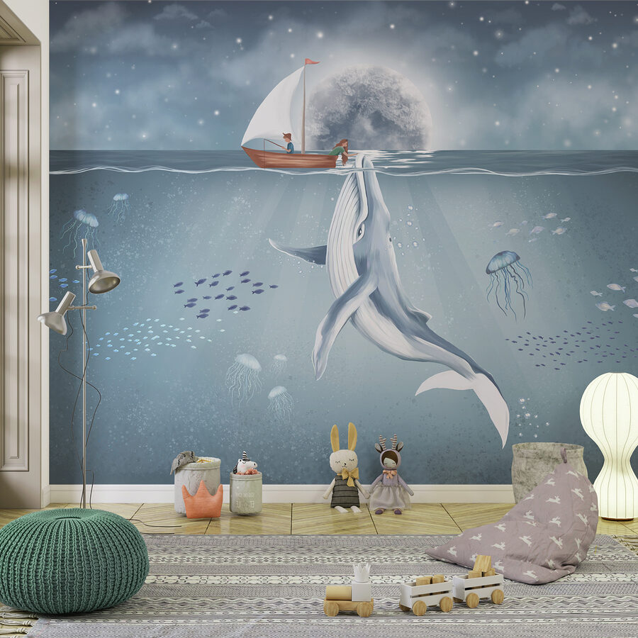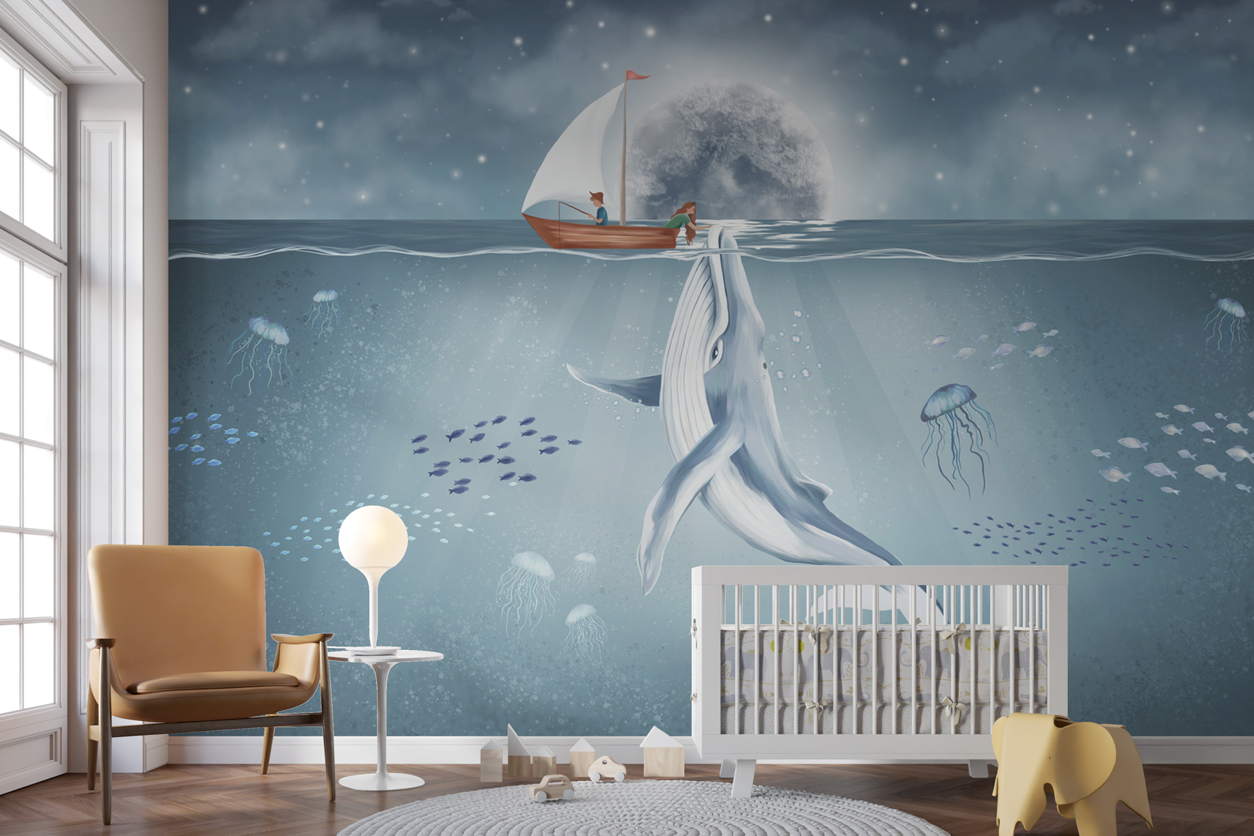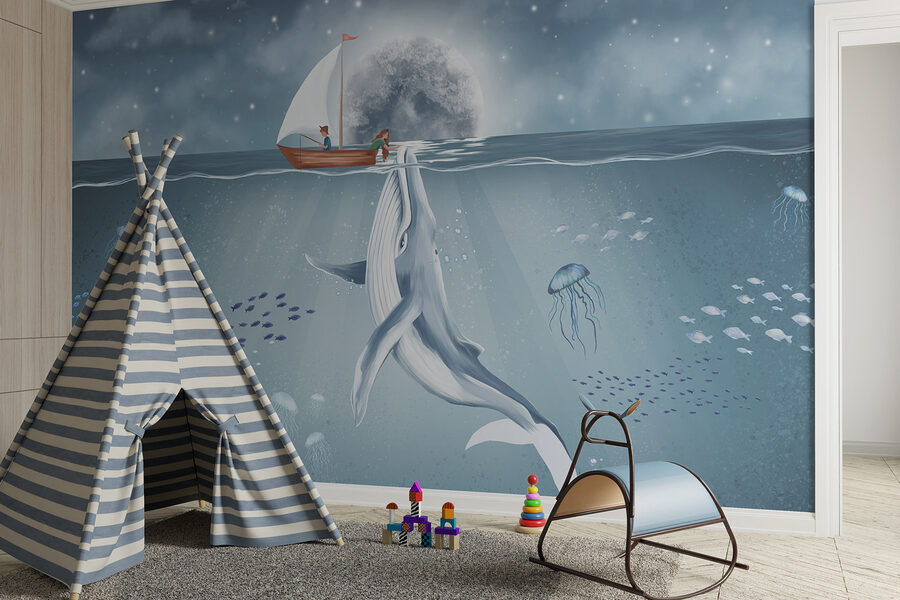 Imagine stepping into a room where a massive whale is gracefully swimming just beneath the surface—yep, that’s exactly what this mural brings to life! “Whale Swimming in the Water” isn’t just a piece of art; it’s like a window to an underwater adventure. Picture a cozy evening with friends, chatting away while glancing at that serene moonlit scene. The soft blues and gentle textures create a calming vibe. It’s the perfect backdrop for daydreaming or telling stories about ocean escapades. Plus, who wouldn’t want a whale buddy hanging out in their space? A conversation starter? You bet! Transform any wall and let the waves of creativity wash over your home.