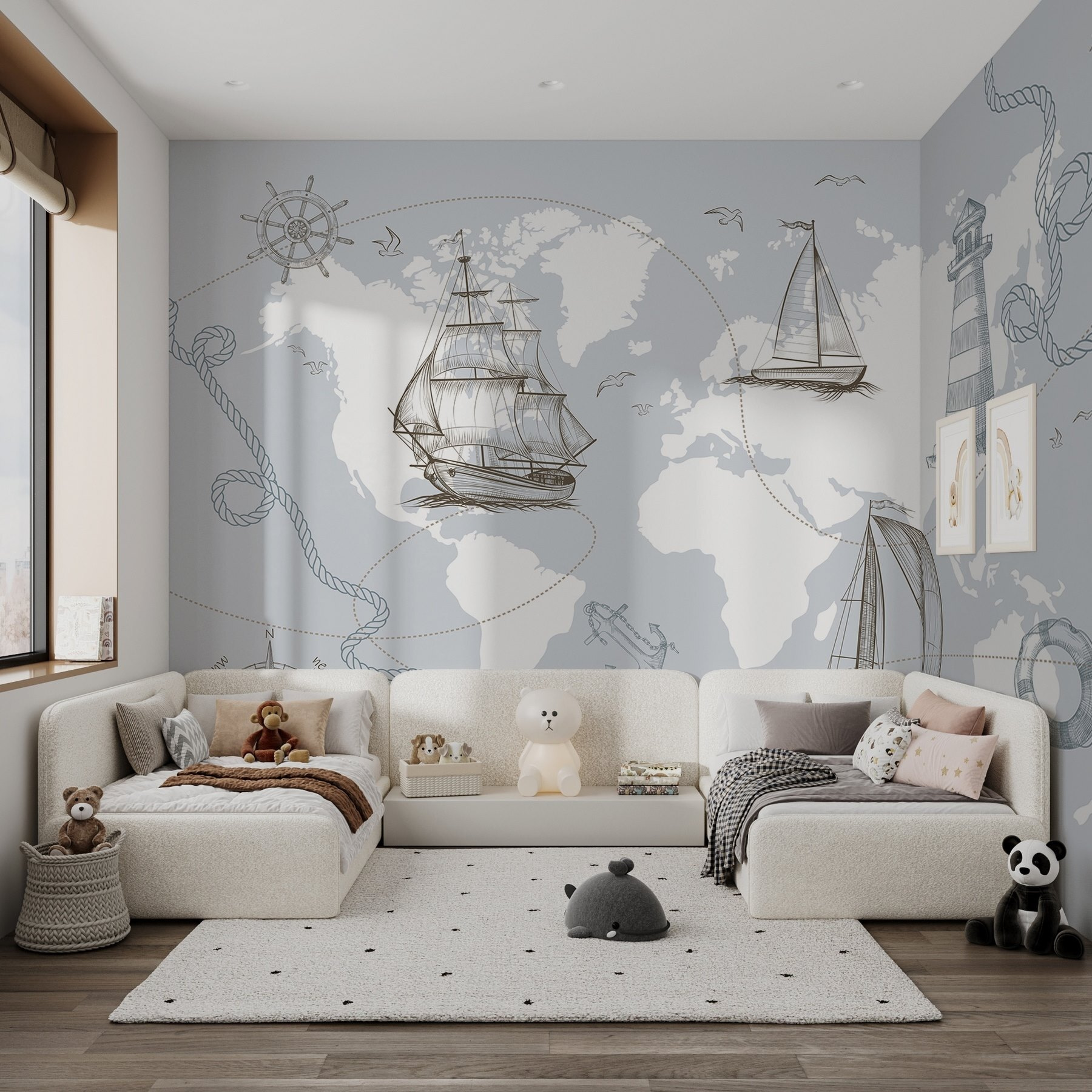 Transform your space into a voyage of discovery with this wall mural featuring a world map and a charming parade of ships. Picture it: waking up in a room that feels like the high seas—without the sea sickness. The muted colors and delicate illustrations create a sense of calm, making it perfect for daydreaming about next adventures. Plus, it could be a great conversation starter for when friends pop by. Who wouldn’t want to chat about where they’d sail off to first? And with this mural, every corner of the room invites a little wanderlust.