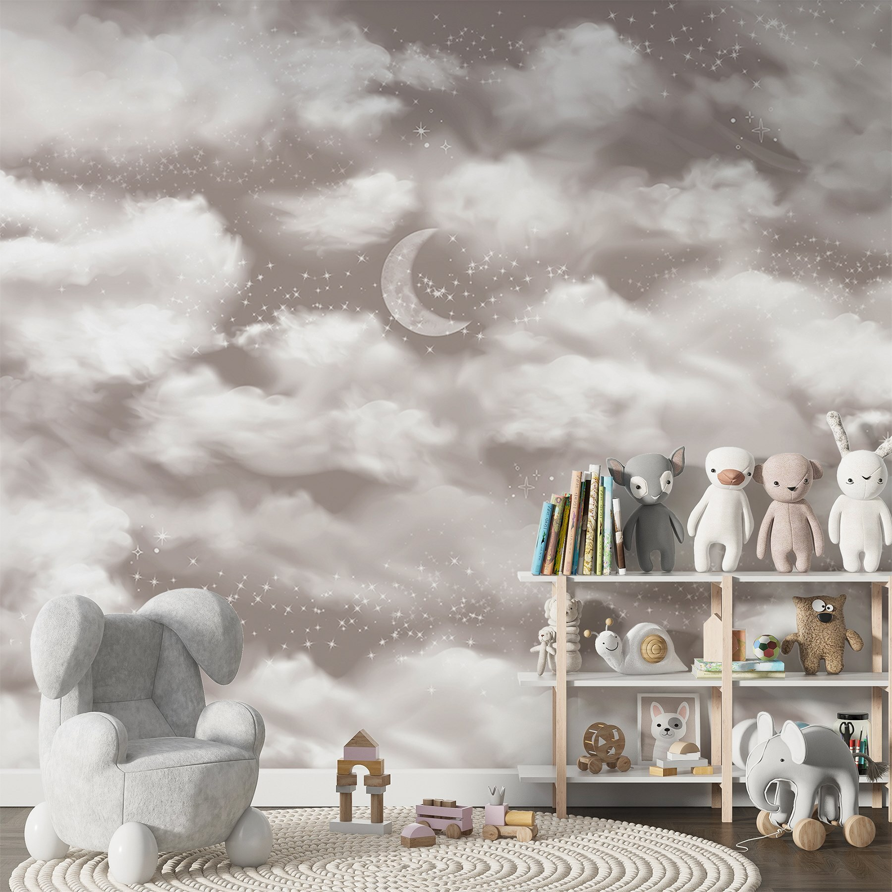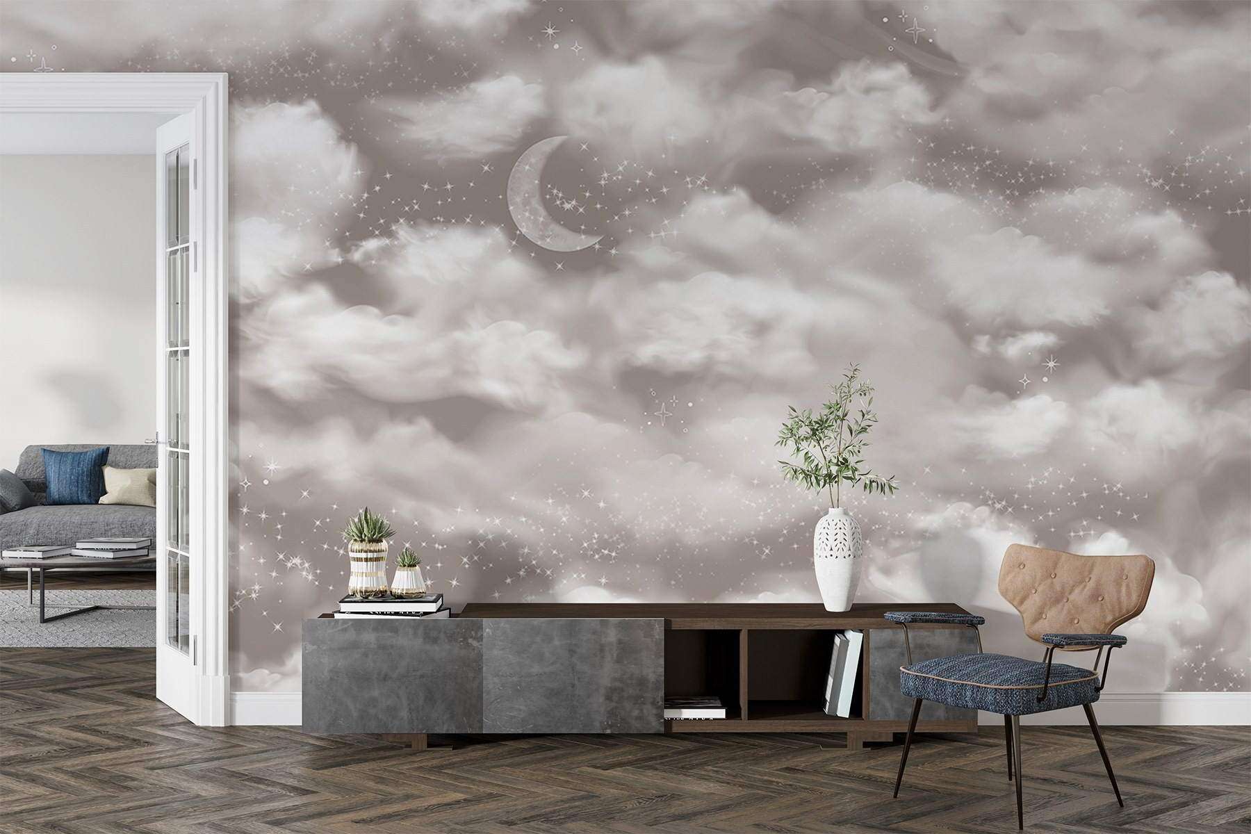 Transform your space into a dreamy escape with the “Moon in the Sky” wall mural. Picture this: fluffy clouds drifting serenely across a soft backdrop, with a gentle crescent moon peeking through. It’s like inviting a piece of the night sky indoors, perfect for those late-night conversations or peaceful moments of reflection. The subtle sparkle of stars brings a touch of magic, making it an ideal feature for a cozy bedroom or a serene reading nook. Imagine sinking into your favorite chair, surrounded by this tranquil scenery—seriously, who wouldn’t feel a bit lighter? Ready to moon-gaze every day?