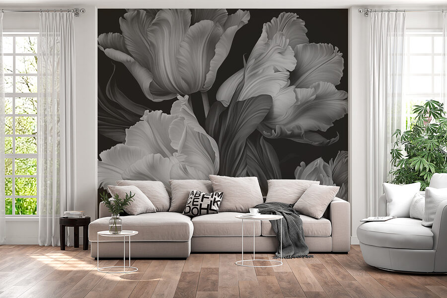 Imagine walking into a room that feels more like a cozy garden than just a space. The “Elegant Tulips in Monochrome Tones” mural brings that vibe right to your walls. With bold, flowing petals and a dreamy black backdrop, it’s like nature decided to throw on its best outfit and strut into your living room.