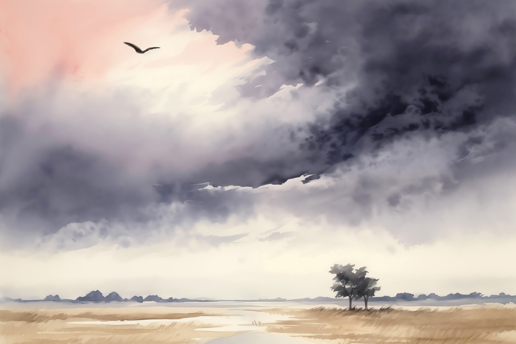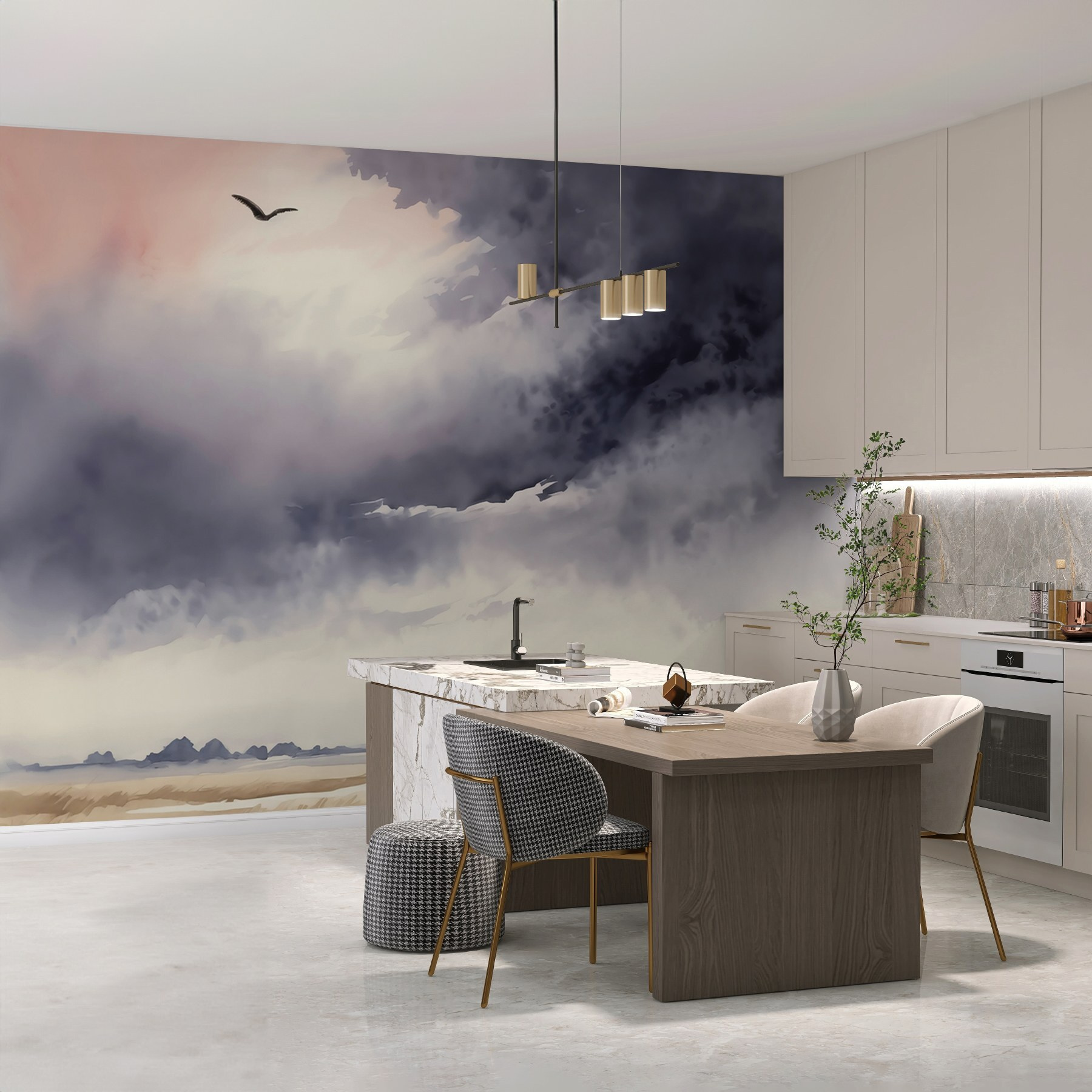Imagine stepping into a room and being greeted by the serene sight of a bird soaring over a sprawling field, the kind of view that makes you want to just breathe deep and unwind. This mural, with its soft watercolor hues and dreamy clouds, captures that blissful moment perfectly. It’s like nature decided to take center stage right on your wall.