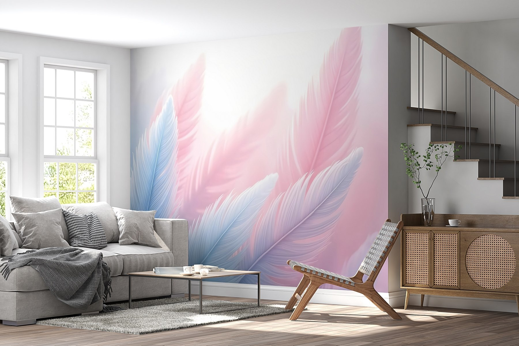 Transform a wall into a dreamy escape with this “Group of Feathers in Light” mural. Picture walking into a room that feels more like a serene sky, with soft pastel colors swirling around. It’s like a gentle embrace from nature, inviting calm and creativity. Imagine sinking into your favorite chair, cup of tea in hand, and letting your mind drift. The feathers seem to float, almost teasing the light; they might just inspire a few daydreams. For those who love a touch of the ethereal, this mural is a beautiful reminder to take life lightly. Perfect for any space craving a bit of whimsy and warmth!