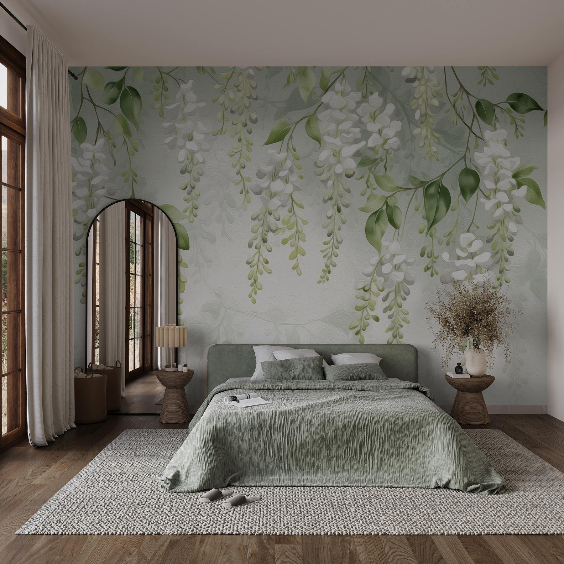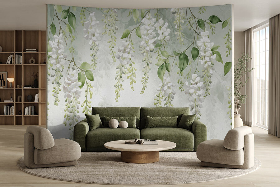 Imagine stepping into a serene space where delicate blossoms seem to dance from the walls. This mural, aptly named “Delicate Blossoms Hanging Gracefully Down,” captures the essence of tranquility with its soft, flowing whites and soothing greens. It’s like having a secret garden right at home—no thorns, no fuss.