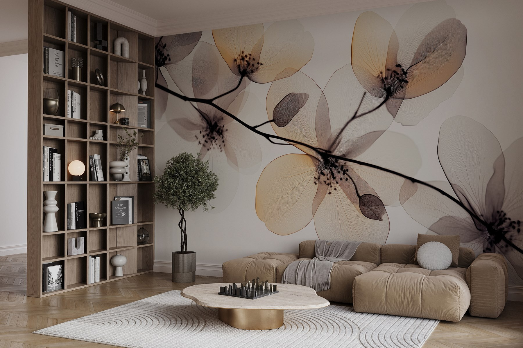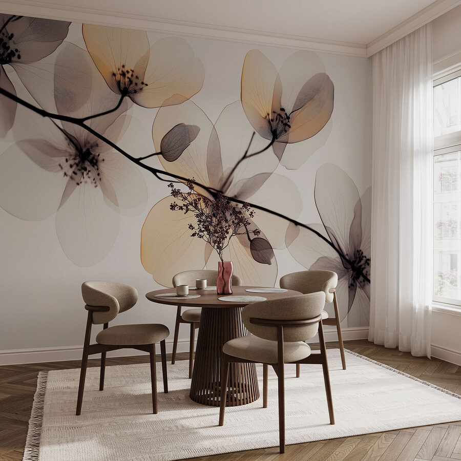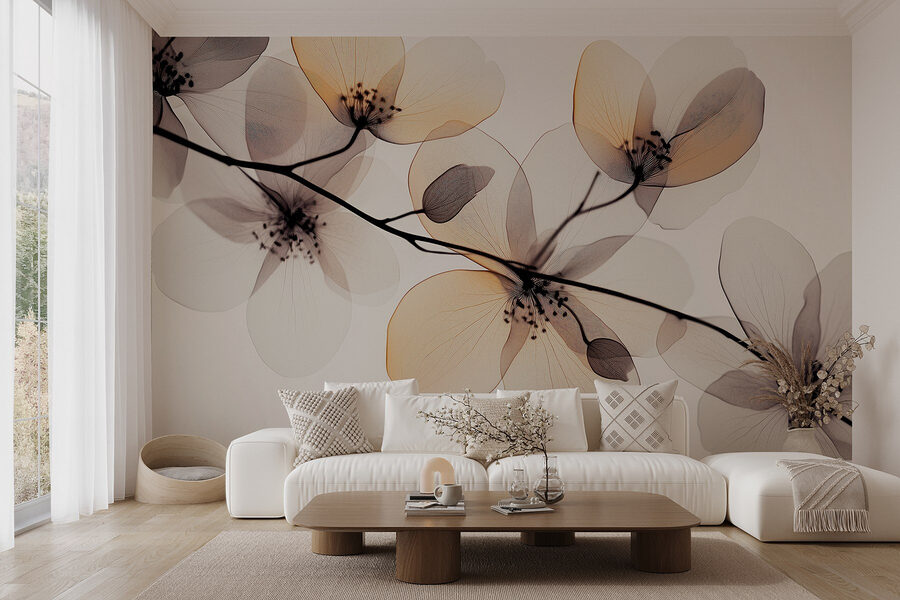 Transform any wall into a soothing retreat with this mural featuring transparent flowers on a branch. It’s like bringing a whisper of a Japanese garden right into your living room. Imagine sipping tea while admiring the soft hues and delicate details that can turn a plain space into something serene.