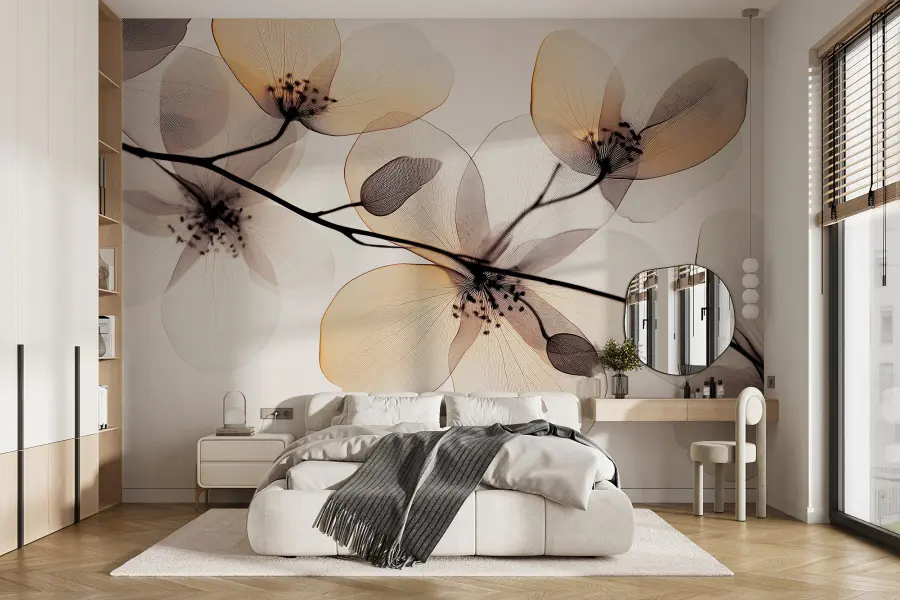 Transform any wall into a soothing retreat with this mural featuring transparent flowers on a branch. It’s like bringing a whisper of a Japanese garden right into your living room. Imagine sipping tea while admiring the soft hues and delicate details that can turn a plain space into something serene.