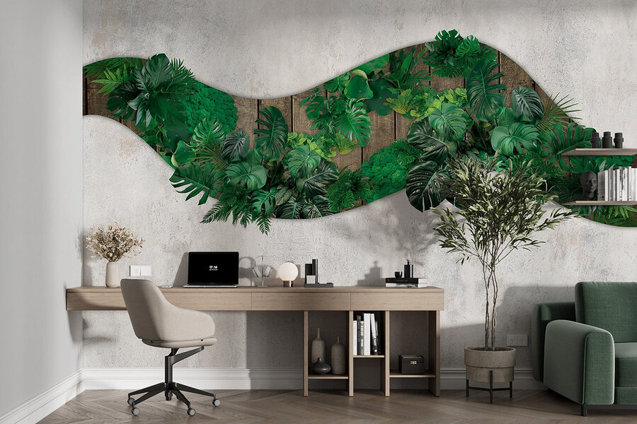 Imagine walking into a room that feels like a tropical oasis—without the humidity! This stunning wall mural, featuring vibrant green leaves against a rustic wooden backdrop, brings a breath of fresh air right into your home. It’s like nature decided to crash your living space! Perfect for anyone wanting to add a touch of the outdoors, it creates a serene vibe and a cozy atmosphere.