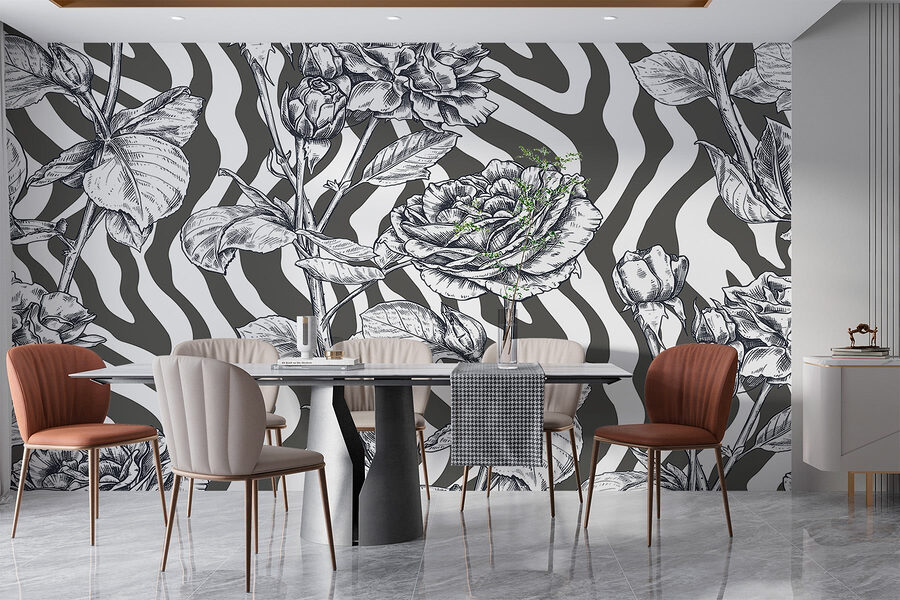 Transform your space with this stunning black and white mural of roses—because who doesn’t want a bit of floral elegance to brighten up the room? Picture this: you walk into your living area and BAM! Gorgeous roses greet you, standing out against playful, zebra-patterned background. It’s chic and a little whimsical, perfect for adding flair to a cozy nook or making a statement in the hallway.