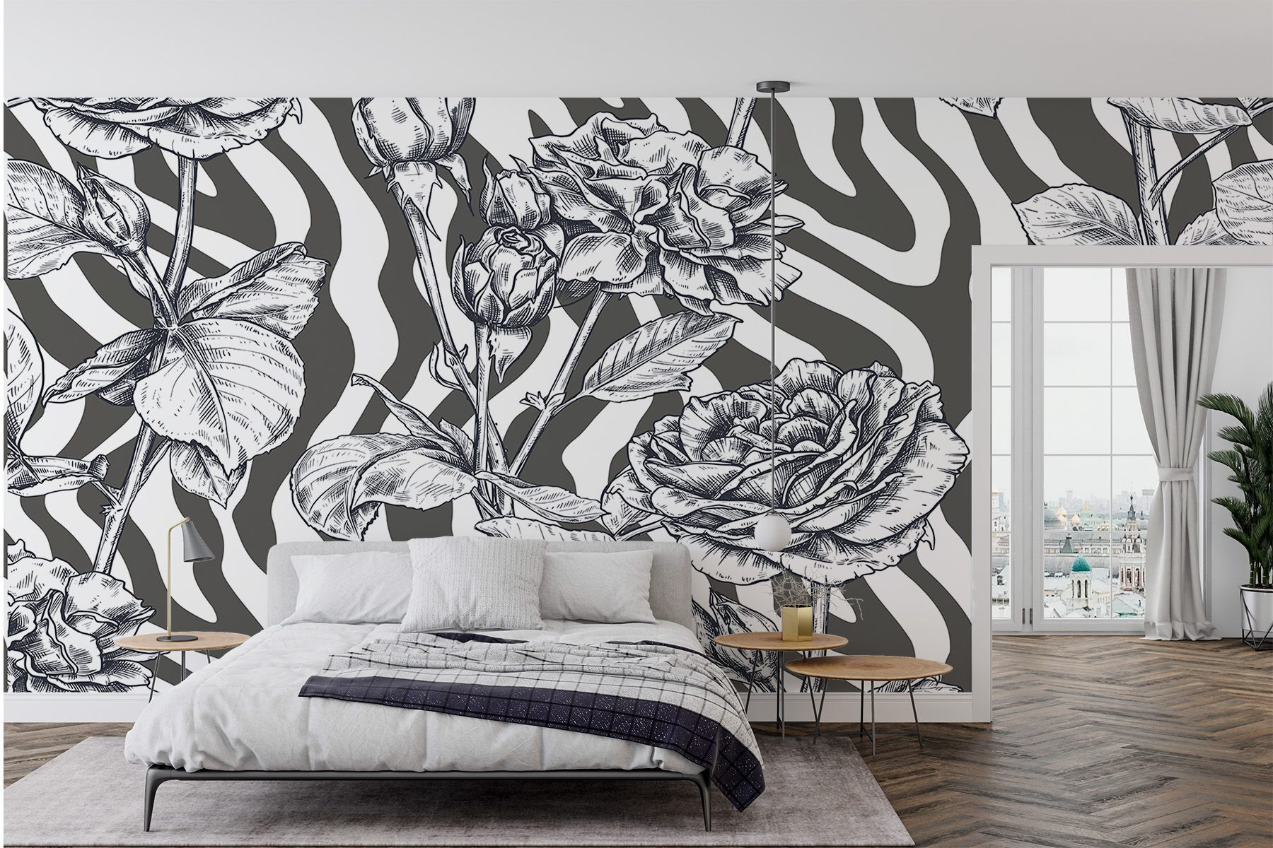 Transform your space with this stunning black and white mural of roses—because who doesn’t want a bit of floral elegance to brighten up the room? Picture this: you walk into your living area and BAM! Gorgeous roses greet you, standing out against playful, zebra-patterned background. It’s chic and a little whimsical, perfect for adding flair to a cozy nook or making a statement in the hallway.