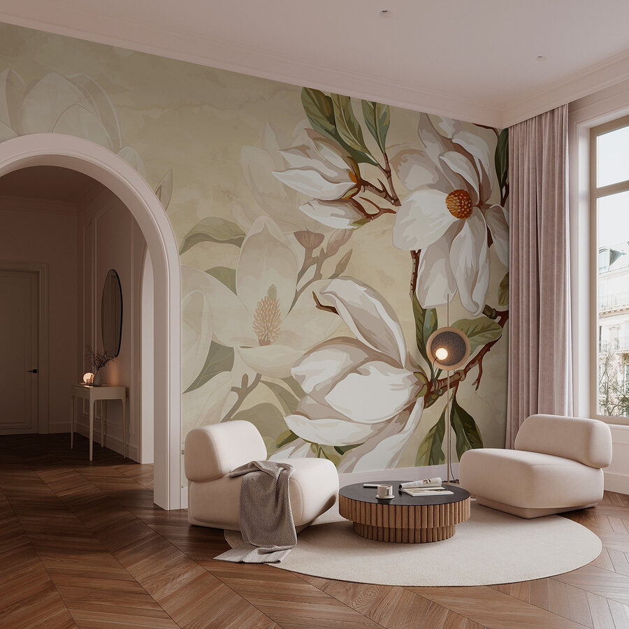 Transform your space with the “Delicate Blooms in Soft Tones” mural—it’s like bringing a serene garden indoors without the need for a green thumb. Imagine waking up to elegant magnolias unfurling their petals, inviting you to slow down over that morning coffee. The muted colors create a soft, dreamy atmosphere, perfect for a cozy reading nook or a peaceful bedroom. Friends will be enchanted, probably asking how you got the garden to bloom all year round! And the best part? No watering required. Just sit back and let those sweet floral vibes brighten your day!