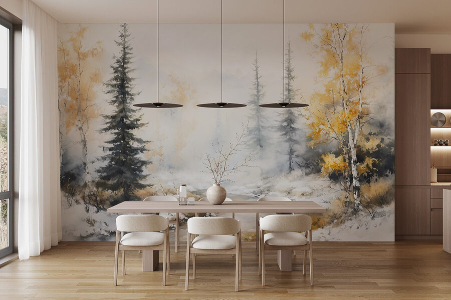 Transform any room with this enchanting watercolor mural, featuring a serene river winding through a snowy landscape. Imagine sipping your morning coffee, wrapped in a cozy blanket, as soft hues of gold and gentle blues invite calmness into your space. The birch trees and tall evergreens whisper stories of nature, effortlessly adding a touch of the outdoors to your decor. It’s like having a mini winter retreat right on your wall! Whether it’s for a quiet reading nook or a fresh backdrop in the living room, this mural creates that dreamy vibe everyone loves. Perfect for nature lovers or anyone wanting to escape into a winter wonderland—without the chill, of course!