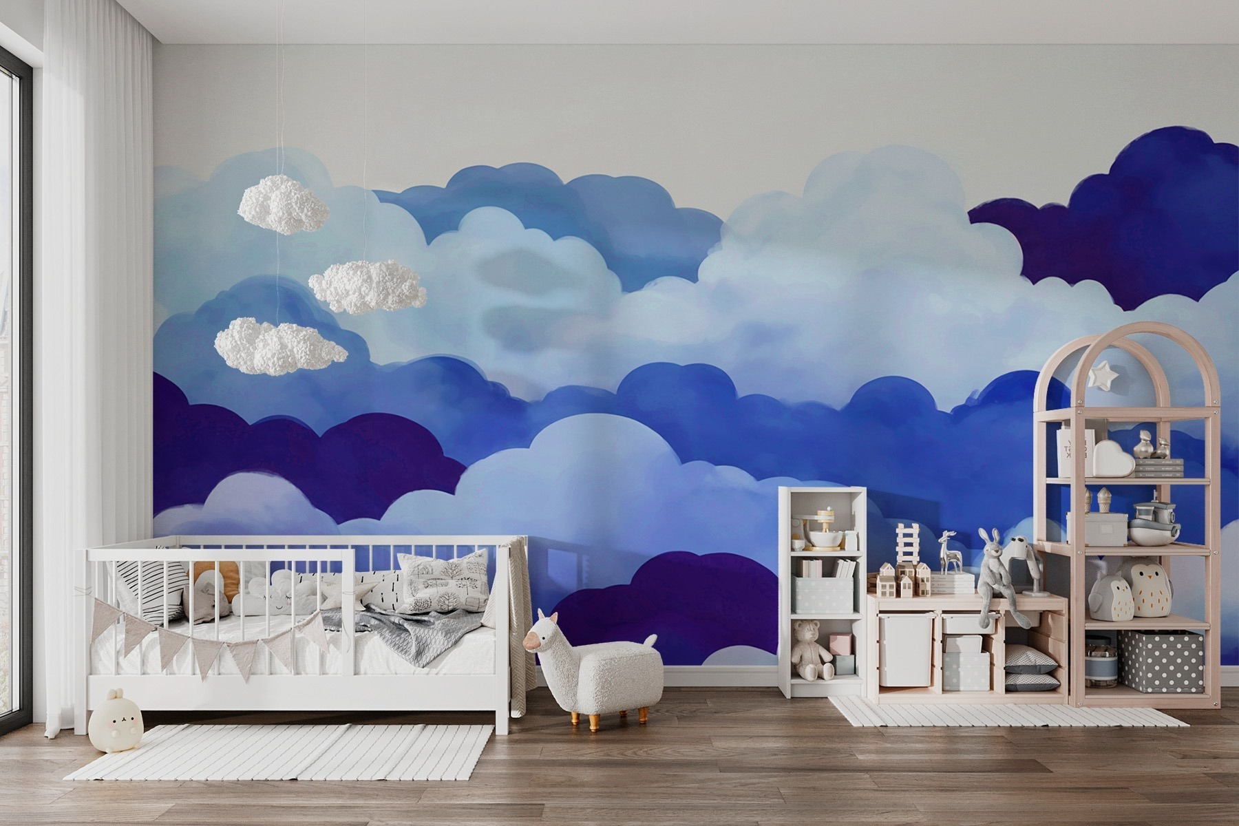 Transform any room into a dreamy escape with this enchanting mural featuring a soft blend of clouds in soothing blues. Imagine waking up, glancing at your wall, and feeling as if you’re floating among these charming puffs. It’s like having a slice of sky right in your home—perfect for adding a touch of tranquility.