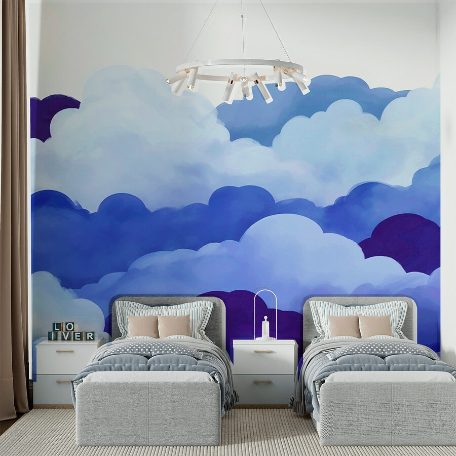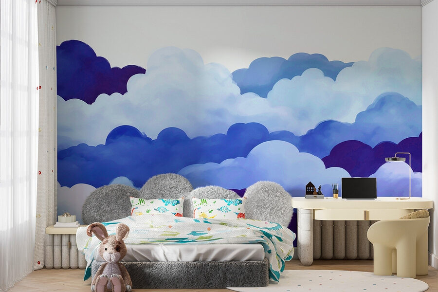Transform any room into a dreamy escape with this enchanting mural featuring a soft blend of clouds in soothing blues. Imagine waking up, glancing at your wall, and feeling as if you’re floating among these charming puffs. It’s like having a slice of sky right in your home—perfect for adding a touch of tranquility.