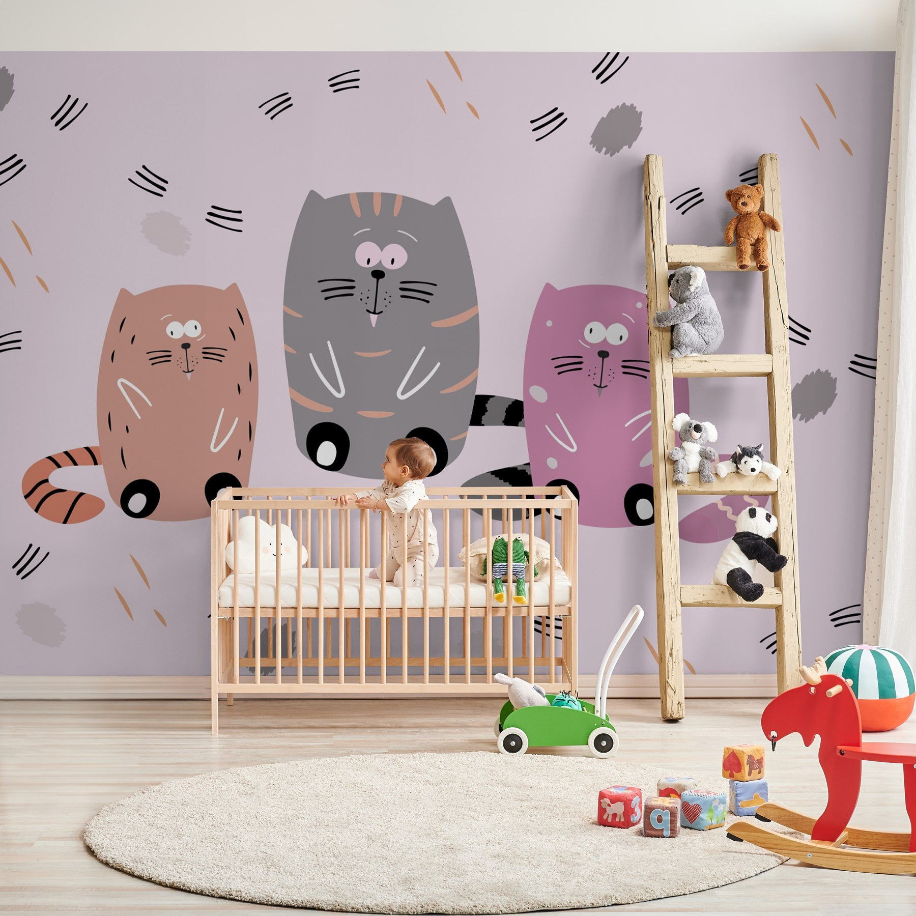 Transform your space into a cozy cat sanctuary with this delightful mural featuring a quirky group of felines lounging on a soft pink surface. These whimsical cats, with their big eyes and playful expressions, seem to purr right off the wall, inviting smiles and warm feelings. Imagine sipping your morning coffee while they keep you company, reminding you of the joy pets bring. Perfect for a playful nursery or a fun corner of your living room, this mural adds charm and personality. Plus, it’s sure to be a conversation starter—who wouldn’t want to meet those adorable furballs? Just be prepared for some serious cat envy!