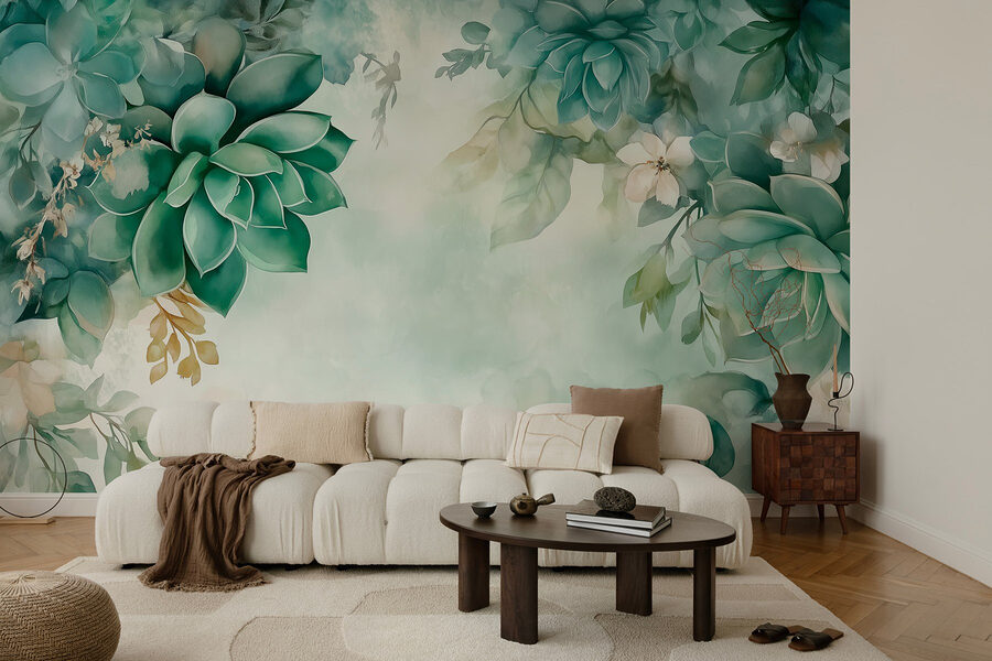 Transform your space with this stunning wall mural, depicting lush green plants and delicate flowers. Imagine waking up to a burst of nature every morning, feeling your stress melt away like ice cream on a hot day. This watercolor painting brings a fresh vibe to any room, making it feel light and airy—a perfect backdrop for cozy chats or peaceful moments with a book.